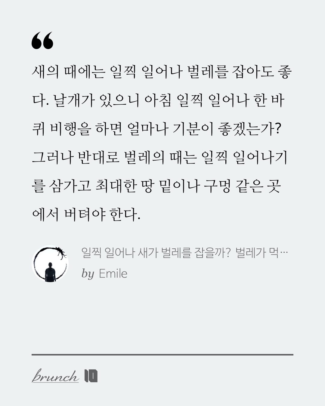 feat 새와 벌레의 때 | 일찍 일어나는 새가 벌레를 잡을까? 아니면 일찍 일어나는 벌레가 새에게 먹힐까? 흔히 부지런함의 미덕을 강조하는 이 말은 내가 절대 '벌레'가 아니라 항상 '새'라는 전제