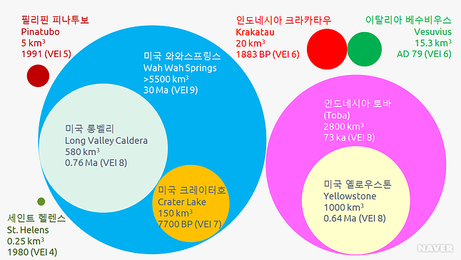 여기서 화산폭발지수(VEI ; Volcanic Exposivity Index)는 화산분출물의 부피를 이용하여 분출형 화산의 규모를 정의하는 것이라고 하네요. VEI 4~6 이상이면 대재앙급 화산에 해당하게 됩니다. VEI 1 차이는 작은 차이 같지만 화산 분출량으로는 무려 10배의 차이에 해당됩니다.