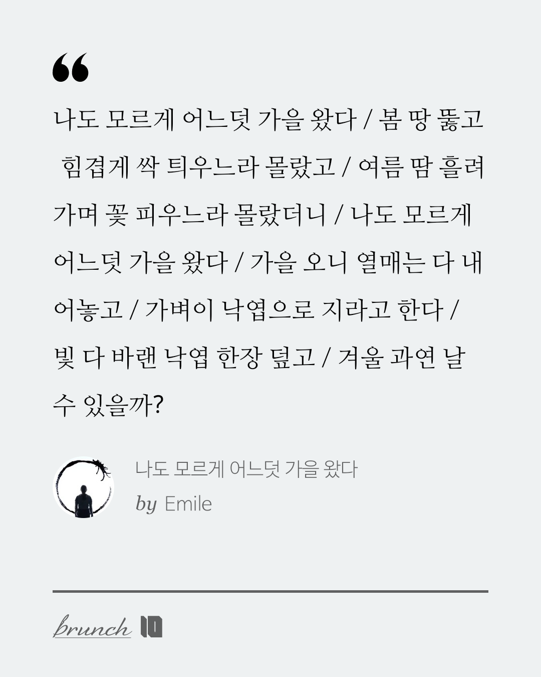feat 나이 | 나도 모르게 어느덧 가을 왔다 / 봄 땅 뚫고 힘겹게 싹 틔우느라 몰랐고 / 여름 땀 흘려가며 꽃 피우느라 몰랐더니 / 나도 모르게 어느덧 가을 왔다 / 가을 오니 열매는 다 내어놓고 / 가