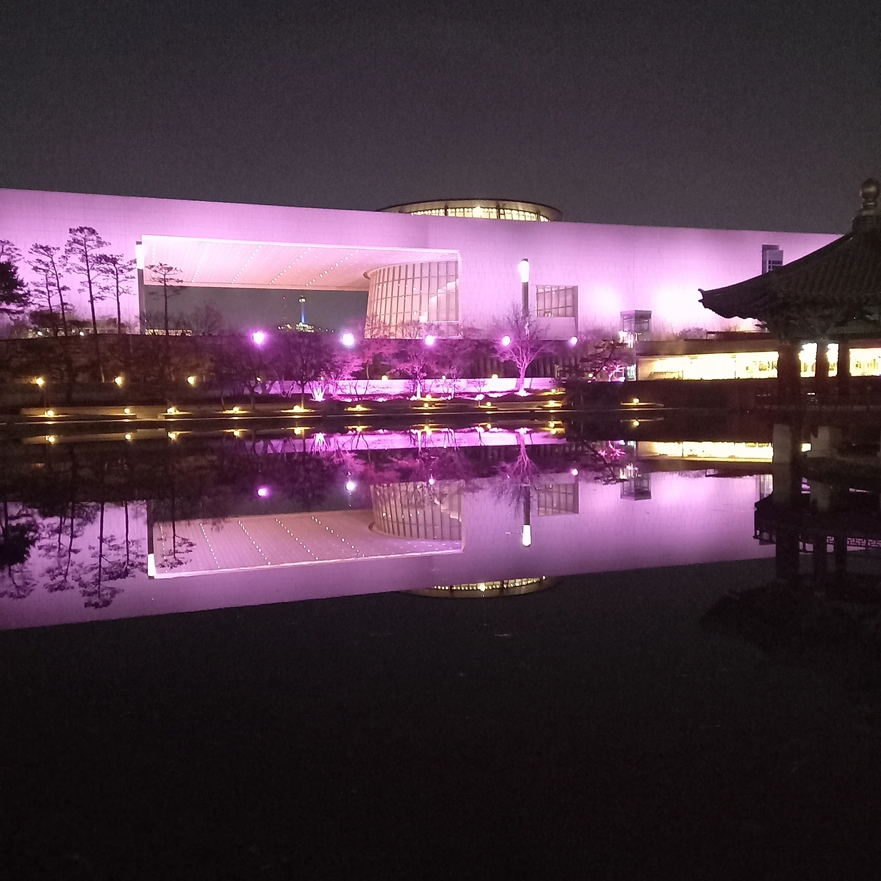 안 그래도 국보급 보물을 모아 놓은 박물관이 분홍색까지 사용하는 것은 반칙이라고 생각하며, 이제 꽃필 날이 얼마 남지 않은 벚꽃빛 야경, 블랙핑크의 반짝임에 스르륵 빠져들고 있노라니, 뭔가 분위기는 멜랑꼴리이고 색깔은 핑크 립스틱 색이어서, 저 낭만정자 아래에서 이 때다 싶게 키스하면 좋을 것 같기도 하고, 그게 다 젊을 때 이야기인 듯 전설 속 환상이기도 하고.