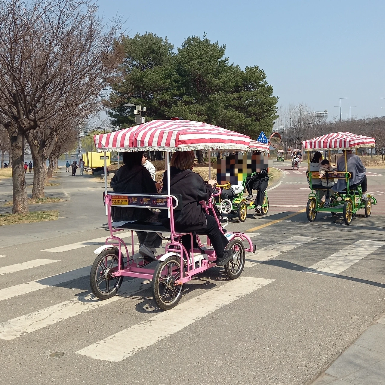 새로운 문물의 등장에 눈이 솔깃해져 "이것이 무엇에 쓰는 물건인고?"하고 이 신차를 유심히 바라보니 자전거를 직렬로 연결한 2인용 자전거는 타봤는데 병렬로 연결한 건 처음이라, 오호라 이거야 말로 낭만의 재구성이라 생각하며 예전에는 왜 이런 게 없었는지 자전거 차양막 속 커플을 부러워 하기도 하고 한대 사버릴까 하기도 하고.