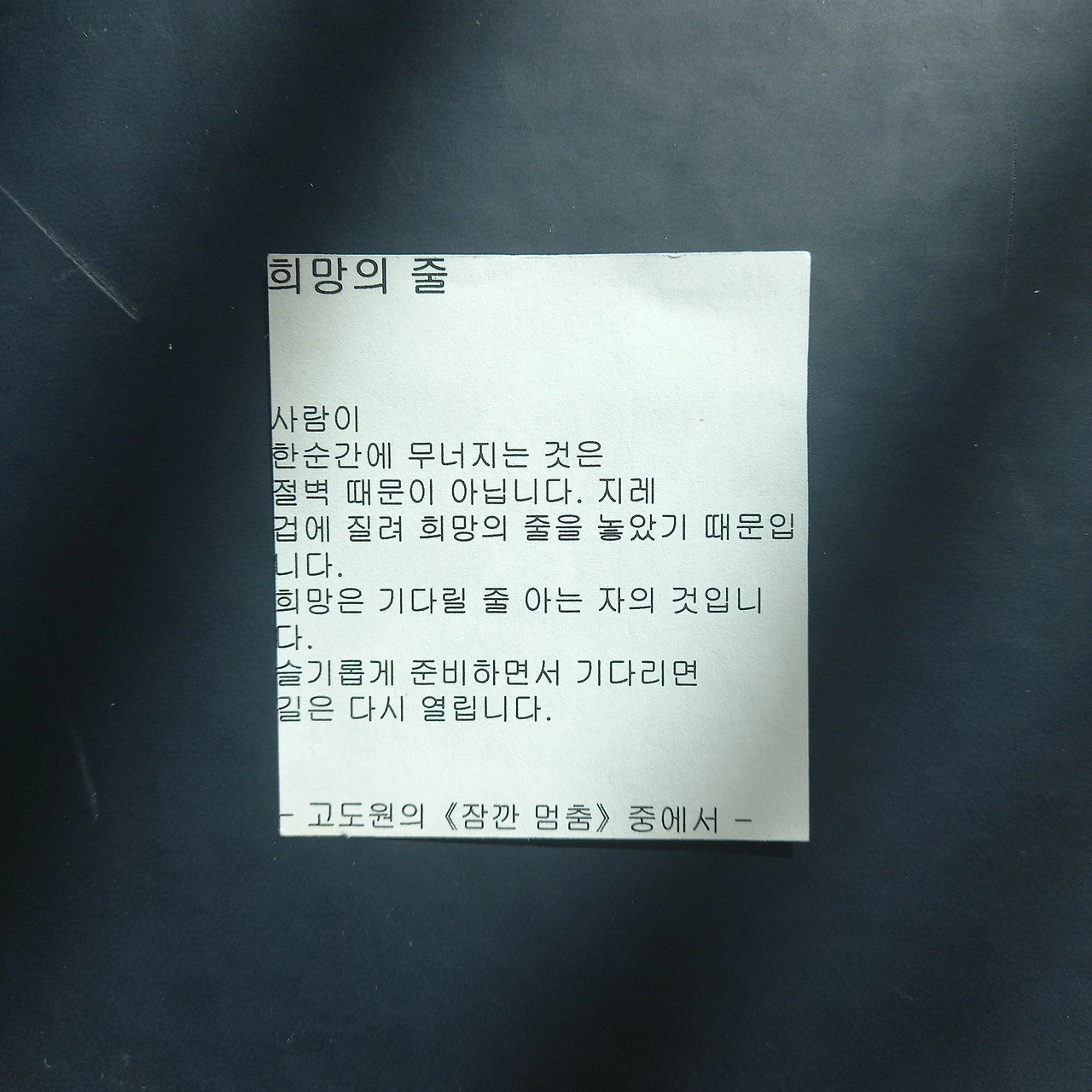 사람이 한순간에 무너지는 것은 절벽 때문이 아닙니다. 지레 겁에 질려 희망의 줄을 놓았기 때문입니다. 희망은 기다릴 줄 아는 자의 것입니다. 슬기롭게 준비하면서 기다리면 길은 다시 열립니다.