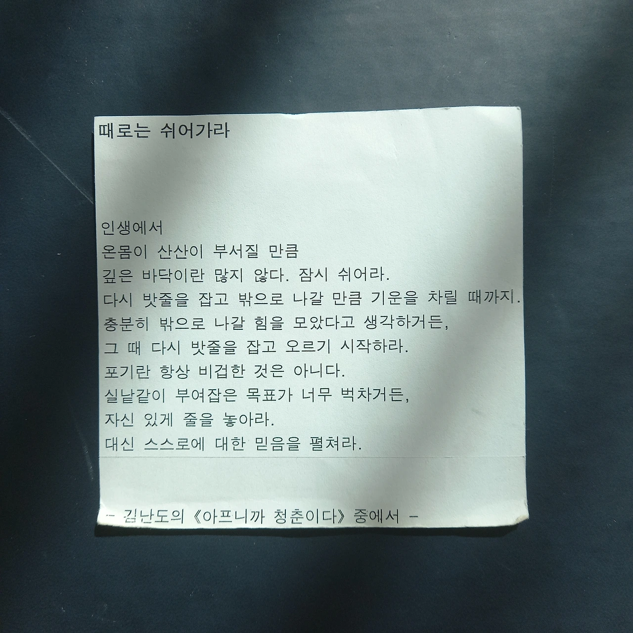 인생에서 온몸이 산산이 부서질 만큼 깊은 바닥이란 많지 않다. 잠시 쉬어라. 다시 밧줄을 잡고 밖으로 나갈 만큼 기운을 차릴 때까지. 충분히 밖으로 나갈 힘을 모았다고 생각하거든, 그 때 다시 밧줄을 잡고 오르기 시작하라. 포기란 항상 비겁한 것은 아니다. 실낱같이 부여잡은 목표가 너무 벅차거든, 자신 있게 줄을 놓아라. 대신 스스로에 대한 믿음을 펼쳐라.