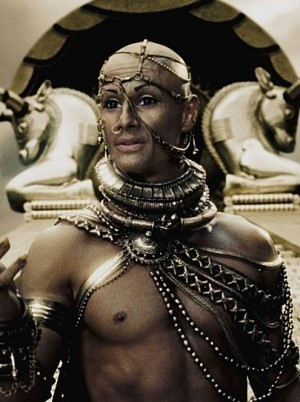 상대편인 크세르크세스 왕은 다소 우스꽝스러운 차림이었긴 하지만 아주 부드럽게 이야기합니다.