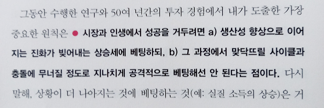 시장과 인생에서 성공을 거두러면 a) 생산성 향상으로 이어지는 진화가 빚어내는 상승세에 베팅하되, b) 그 과정에서 맞닥뜨릴 사이클과 충돌에 무너질 정도로 지나치게 공격적으로 베팅해선 안 된다는 점이다.