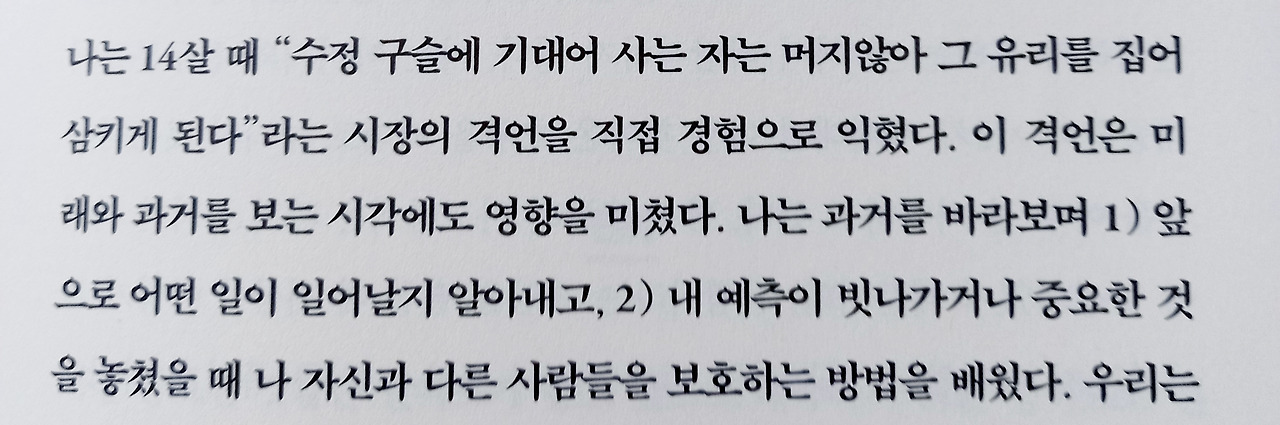 무슨 뜻인지 모르겠어서 몇 번을 다시 읽었습니다. 과거를 통해 미래에 일어날 일을 알아낸다는 것인지, 미래에 집착하면 과거에 빠지게 된다는 것인지, 저자는 전자라고 이야기하고 있는 것 같았지만 개인적으로는 후자로 생각되었거든요.그래도 미래를 알기 위해서는 과거를 돌아볼 수밖에 없겠지요. 인생도, 유행도 시곗바늘도, 지구도, 다 돌고 도는 것이 세상사니까요.