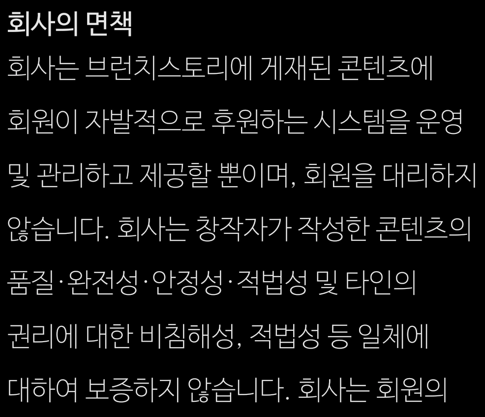 그러면서도 시스템을 운영 및 관리하고 제공한 뿐이라며 '면책'에 대하여는 아주 상세하게 기술하고 있습니다. "선정은 하겠지만 후원에 책임은 지지 않으시겠다?"라는 것이지요.