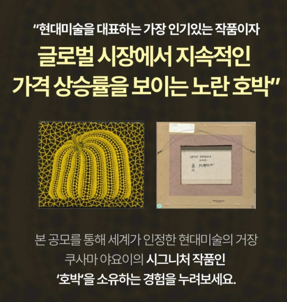 쿠사마 야요이의 호박에 투자하라고 합니다. 통째로 작품을 파는 것은 아니고 조각투자인가 봅니다. 마치 액자퍼즐의 퍼즐 한 조각조각들을 따로 파는 형태지요. 그림 값은 약 12억 원 정도하고 10만 원을 들이면 1만 2천여 퍼즐 조각 중 하나를 가질 수 있는 기회라네요.