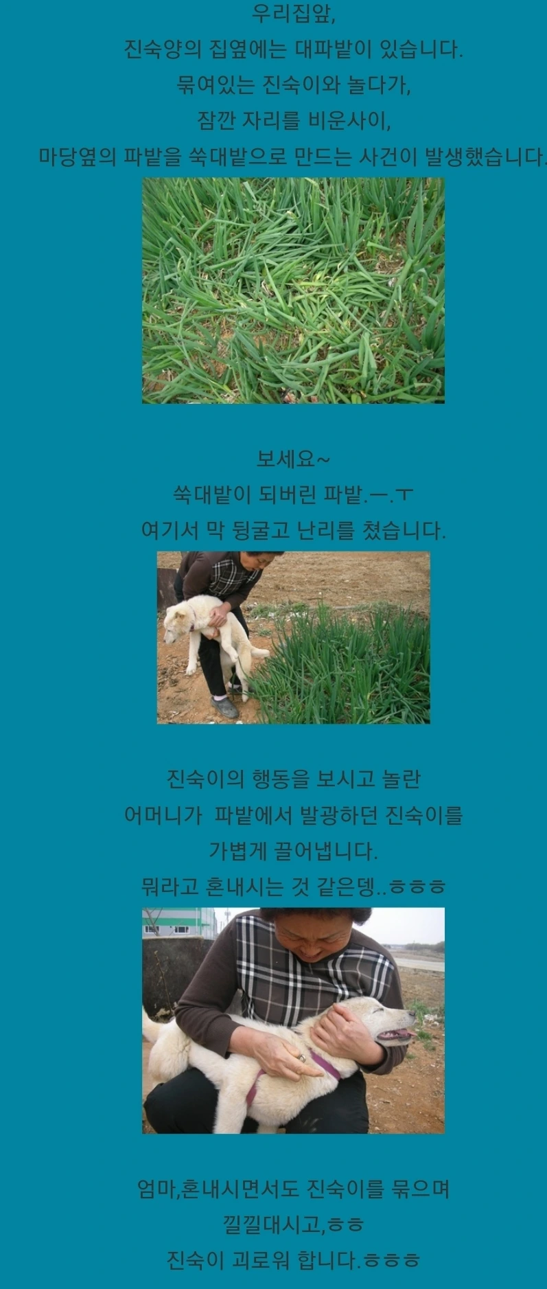 "이놈, 진숙이! 풀어졌다 하면 사고뭉치네. 당장 목 줄 채워서 묶어놔야지 안 되겠다!"