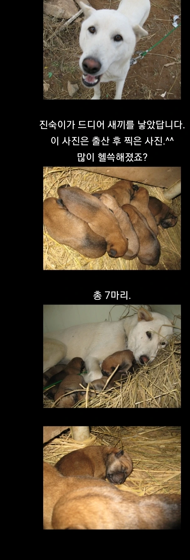마냥 아기 같았던 진숙이가 황구를 7마리나 낳은 날이었다. 진숙이는 백구인데, 왜 새끼들 모두 황구인지 의아했다. 의문에 대한 해답은 엄마를 통해 알게 됐다.