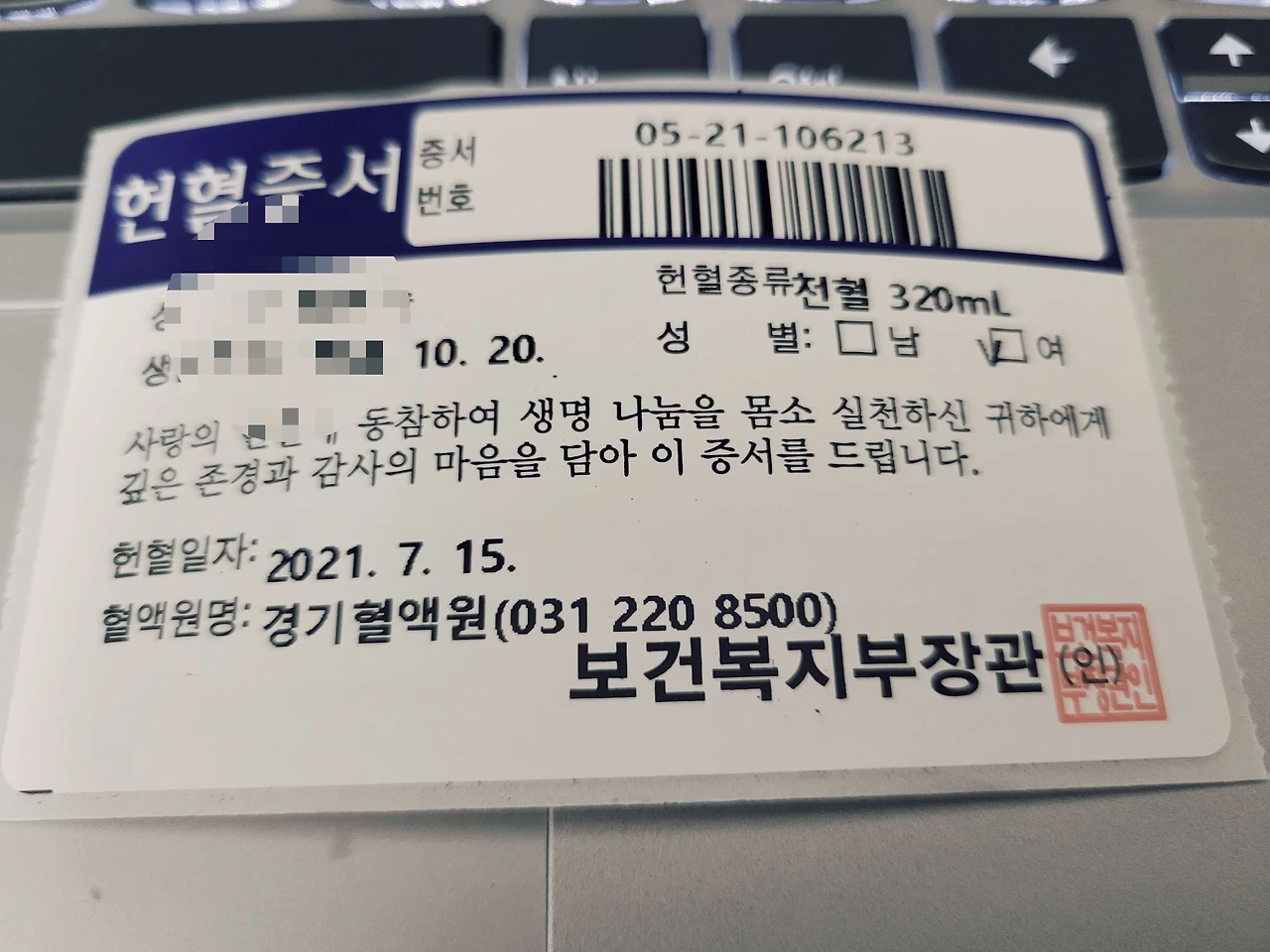 헌혈 후 가장 뿌듯했던 건 헌혈증서였다. 내 이름이 적힌 첫 헌혈증서. 초등학교 때 교장선생님께 표창장을 받은 것처럼 행복한 기분이었다. 비록 남편을 위해 헌혈을 했지만 다음번에는 누군가의 생명을 살리는 일에 동참하고 싶은 마음이었다. 헌혈을 하는 도중 혈액을 기부하기 위해 스스로 찾아오는 젊은 사람들을 만났다. 그들의 표정은 밝고 긍정 적여 보였고, 헌혈을 마친 발걸음은 통통 경쾌해 보였다. '이런 게 진정한 봉사구나!'