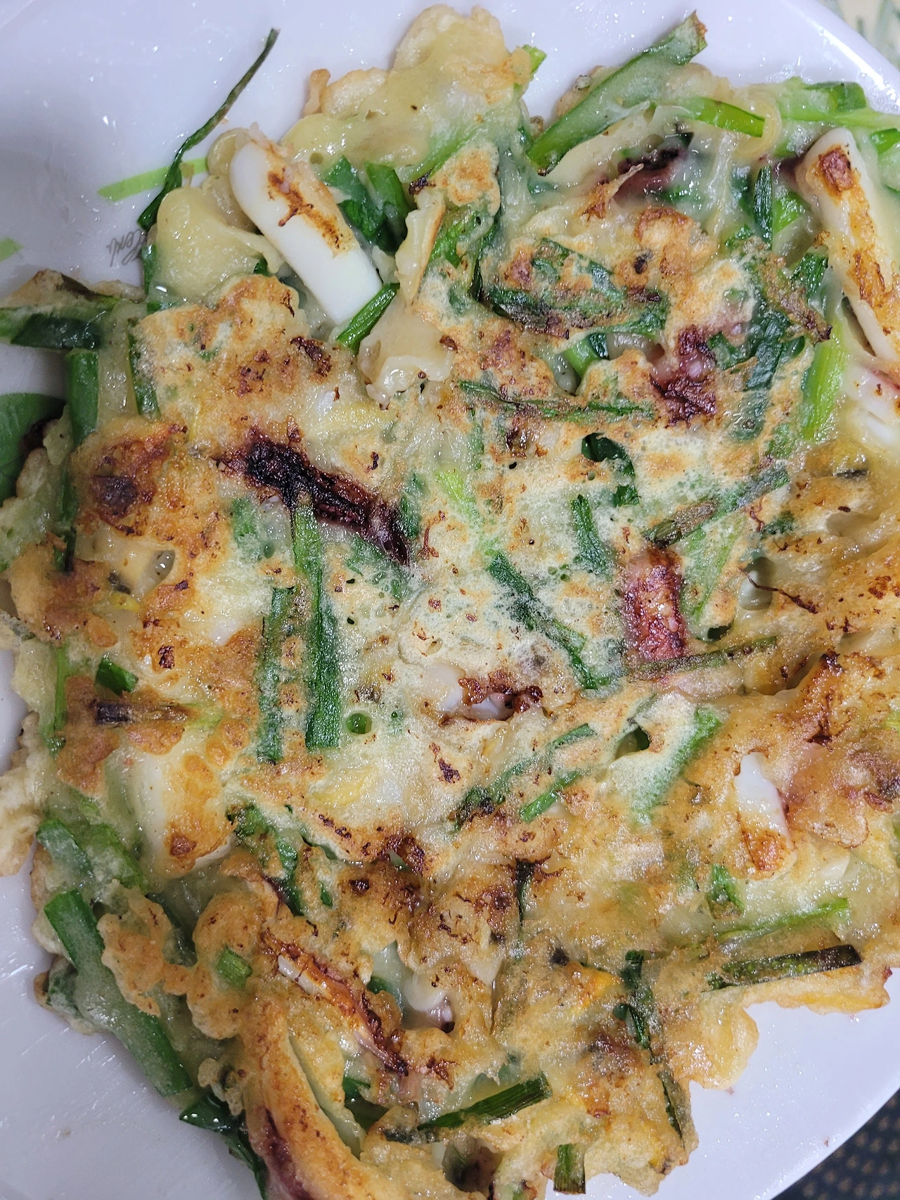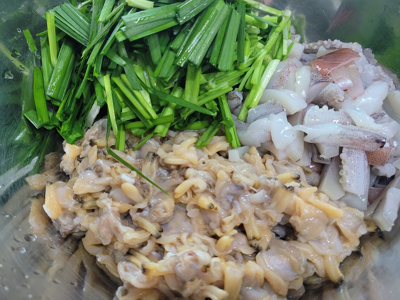 생바지락, 오징어 두 마리, 부추, 홍고추, 후추, 부침가루 (부침가루에 간이 되어있다)