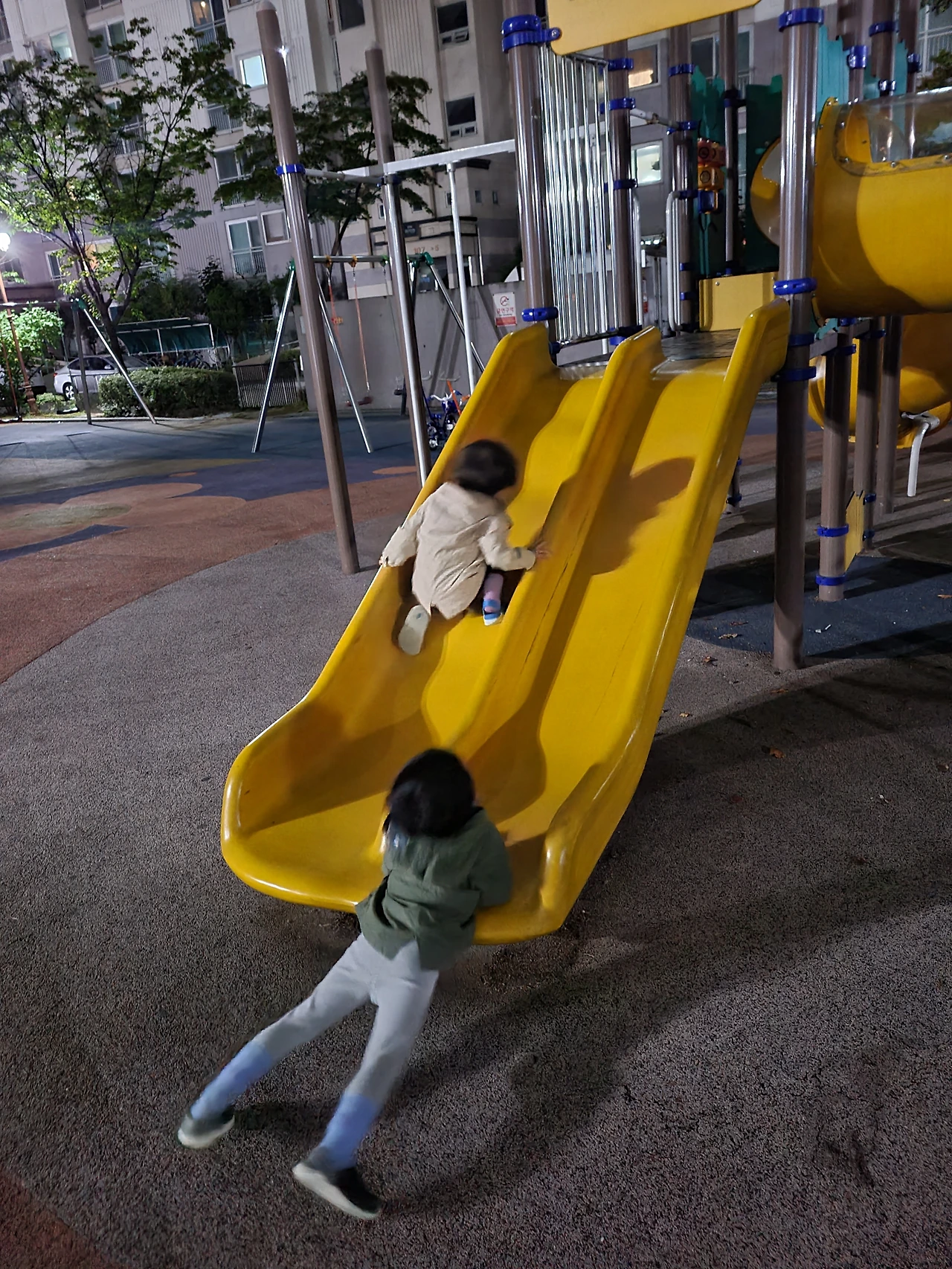 토요일 저녁 우리 가족은 자전거를 타고 놀이터로 나왔다. 늦은 저녁 시간에는 다른 아이들 방해 없이 놀이터는 아이들 차지다. 미끄럼틀 위에서 아이에 작은 몸이 바람을 타고 슝 내려온다. 깔깔깔 웃음소리가 하도 커서 아파트 주민들이 민원이라도 넣을까 걱정될 정도였다. 미끄럼을 타던 아이는 그네에 몸을 맡긴다. 평소 놀이터에서 자주 놀지 않았던 아이는 그네를 잡고 있는 양손이 위태롭다. 혹시라도 그네에서 떨어질까 두 손을 후들후들 떨고 있는 게 아닌가. 후들후들, 깔깔깔, 교차하듯 보이는 상반된 모습에 안쓰럽기도 대견한 모습에 미소가 지어졌다.