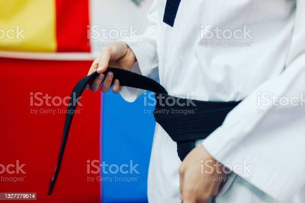 머리를 높게 묶고 검은 띠를 허리에 단단하게 매고 옆차기를 하는 모습을. 돌려차기는 기합을 많이 넣어도 안 될 것 같다.