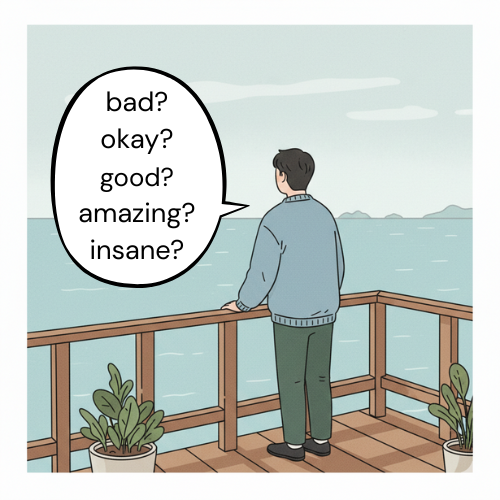 하지만 한편으로는 단어를 많이 안다고 끝나는 건 아니라는 생각이 들었습니다. 알고 있는 어휘의 양만큼 표현 습관이나 사고방식도 중요한 게 아닐까요? 요즘 제가 하는 대화를 돌이켜보면 참 단촐합니다. 누가 "어디 어땠어?"라고 물어도 대답이 그냥 저냥 비슷하죠. 나빠-별로야-그냥 그래-좋아-정말 좋아-역대급이야. 여기서 왔다 갔다하는 느낌이랄까요? 어떤 대상에 대해 말하더라도 그 수준을 평가하는 데 집중하고 있는 것이죠.
