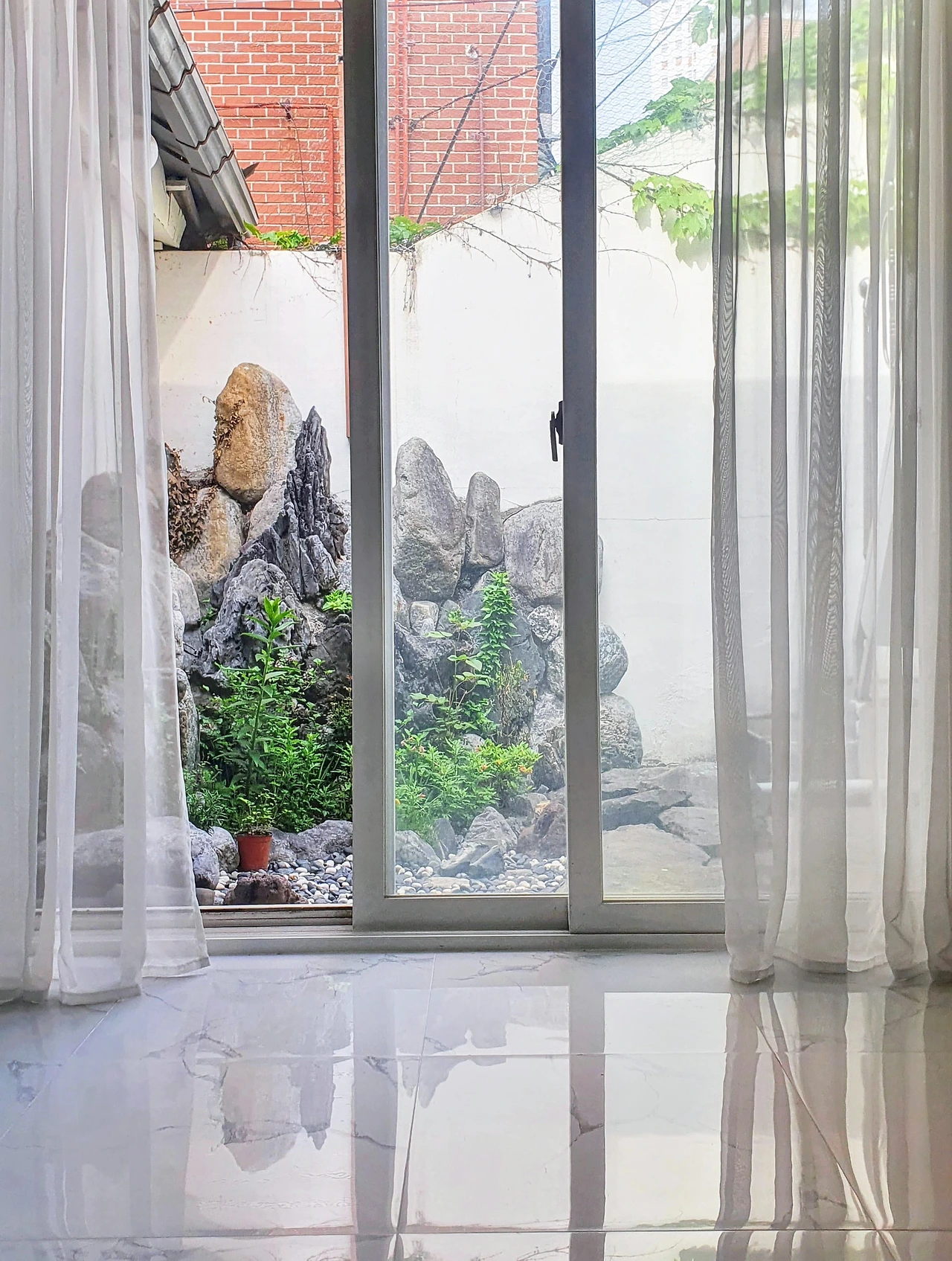 안타깝게도 한 공간 안에서 채광ㆍ통풍과 보안ㆍ프라이버시를 구현하는 방식은 서로 상충하게 됩니다. 특히 좁은 공간에서는 둘을 동시에 확보하기 어렵기 때문에 더 중요한 하나를 선택할 수밖에 없습니다. 나는 후자를 택했습니다. 정확히 말하면 내가 담장을 높게 만든 게 아니라, 원래 담장이 높았는데 그걸 받아들인 것이죠. 지금은 마당의 제일 안쪽 구석에 앉으면 담장이 이웃 건물을 완벽히 가려줘서 안심이 되고 좋습니다. 깊은 욕조 안에 들어앉은 느낌이랄까요, 마음이 편안합니다. 다만, 볕이 부족해서 웃자라는 식물들한테는 진심으로 미안하고 힘겹게 피어난 꽃들이 금방 지는 게 안타까울 따름입니다.
