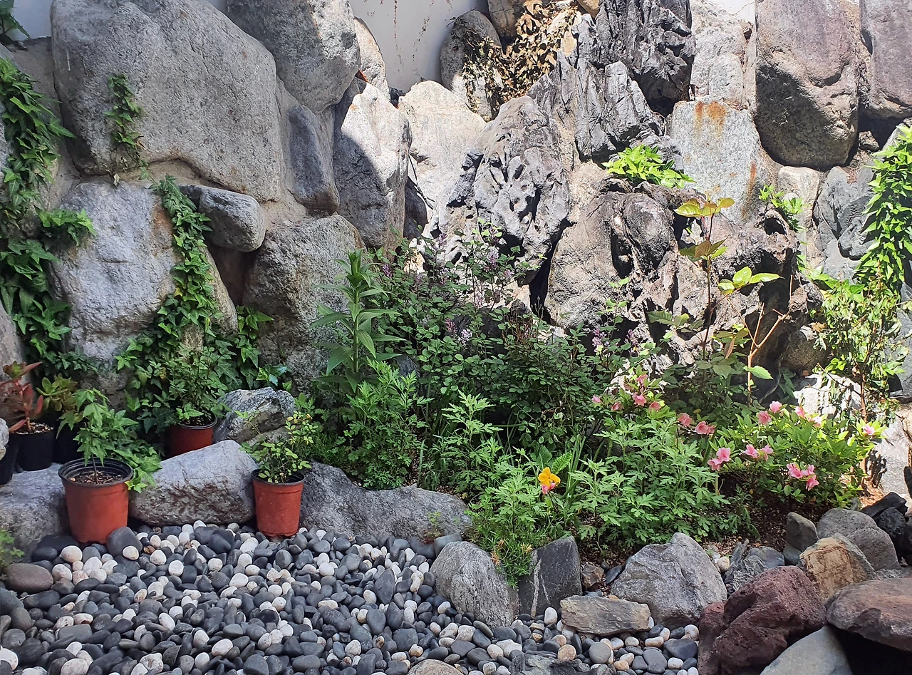 원래는 작은 마당의 3분의 1 정도를 전 집주인이 만든 수경시설이 차지하고 있었습니다. 담장 중간부터 바닥까지 이어지도록 큰 돌을 쌓고 시멘트로 붙여서 돌 위로 물이 흐르다가 바닥에 작은 연못처럼 고이도록 만들었는데, 방치된 지 오래되어 고인물이 썩어 있더군요. 말이 수경시설이지 물이 흐르고 고이는 부분은 작고, 어떻게 옮기고 붙였는지 모르겠다 싶게 큰 돌이 무더기로 쌓여있는 거라고 하는 편이 더 정확합니다. 없는 게 낫겠지만 철거를 하려면 비용도 크고 담장이 붕괴될 위험도 있어 보여서 썩은 물을 빼내고 그 자리에 흙을 채워 꽃밭으로 만들었습니다. 처음에는 3분의 2 정도를 채우고 가장자리부터 식물들을 조금씩 심었죠. 새로 식물을 심을 때마다 흙이 더해지고 돋워져서 지금은 꽉 채웠네요. 나의 사랑하는 꽃밭은 그렇게 만들어졌습니다.