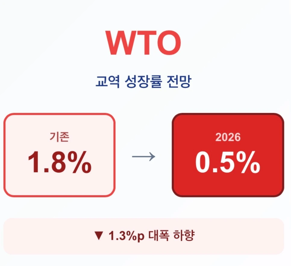 세계무역기구(WTO)는 2026년 세계 상품 교역 성장률을 0.5%로 대폭 하향 조정했습니다. 이는 이전 예측치 1.8%에서 무려 1.3%포인트나 낮아진 수치입니다.