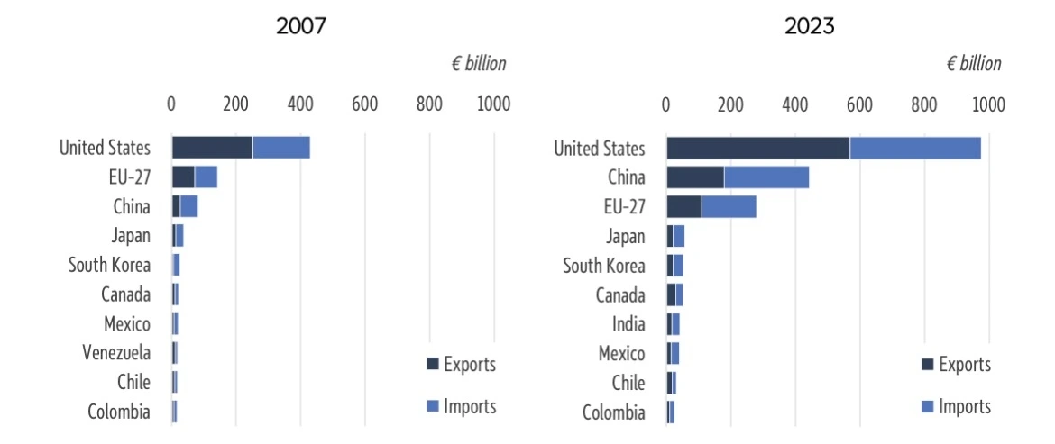 현재 중국은 남미 거의 모든 국가의 최대 교역국입니다. 2025년 5월 베이징 CELAC 포럼에서 중국은 **90억 달러 규모 투자를 약속했고, 2020-2024년 기간 남미 광물 부문에만 213억 달러를 투자했습니다.