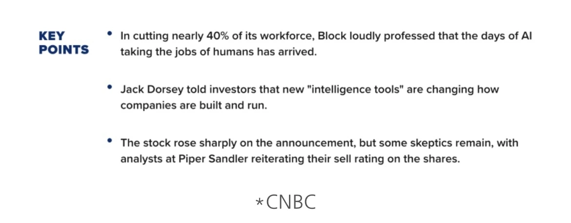 2026년 2월 27일, 핀테크 기업 Block(잭 도시 창업)은 전체 직원의 40%인 4,000명을 해고한다고 발표했다. 10,000명이 넘던 인력을 6,000명 이하로 줄이는 것이다.