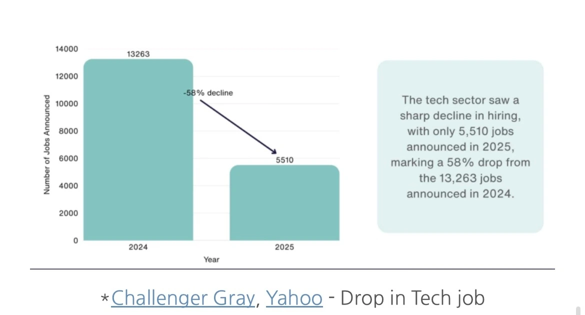 2025년 한 해 동안 AI에 직접 기인한 미국 내 기술직 일자리 손실은 77,999건으로 집계됐다(Challenger, Gray & Christmas).