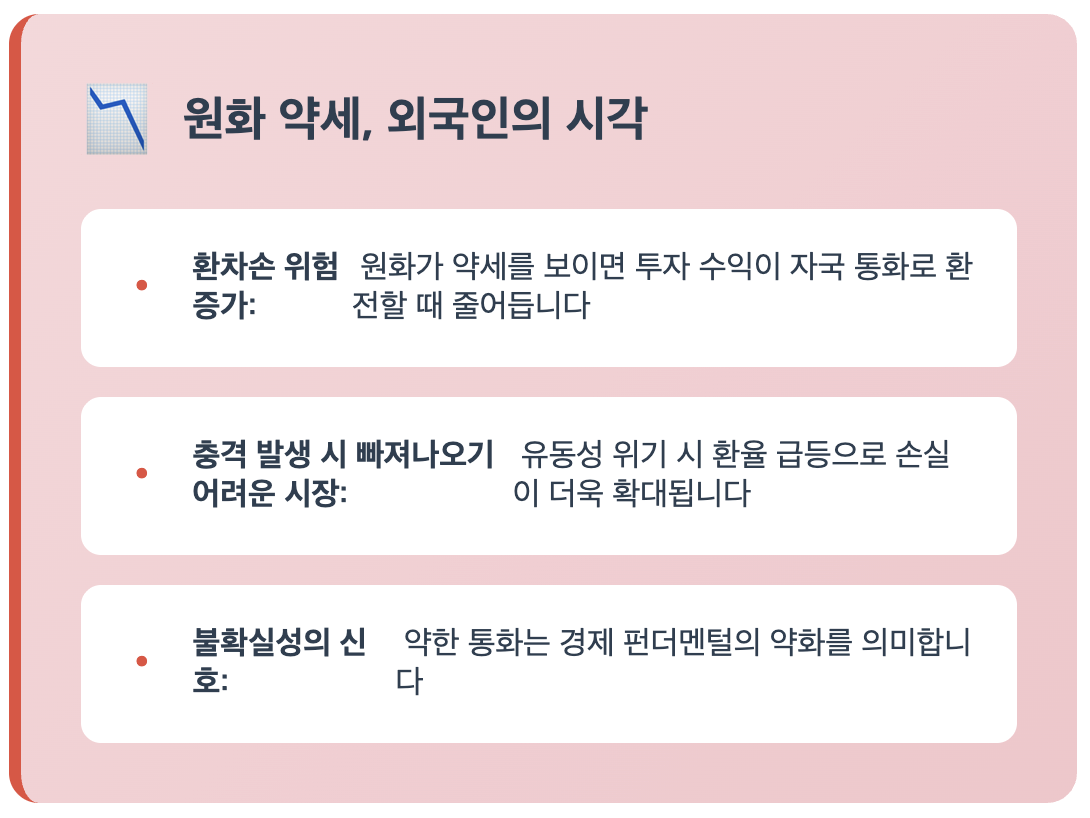 현재 원화는 뚜렷한 약세 흐름을 보입니다. 원화 약세는 외국인의 눈에 다음과 같이 보입니다.
