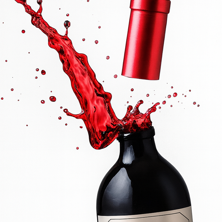 와인 한 병이 열리는 순간, 붉은 액체가 공기 속으로 튀어 오릅니다.