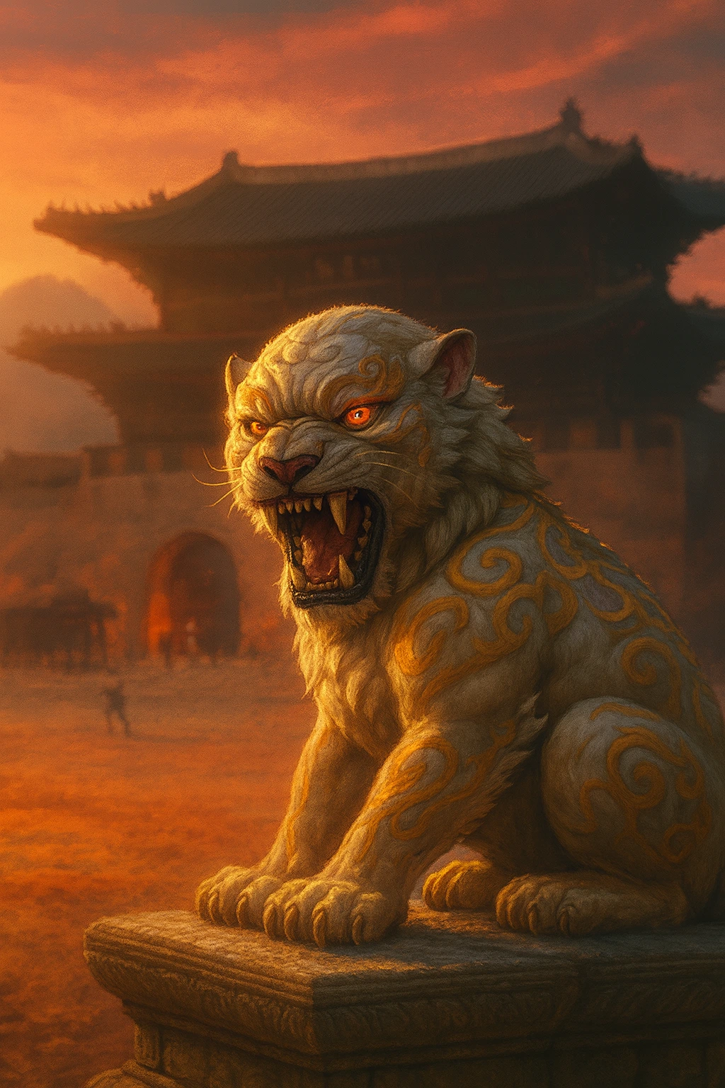 뜨겁지 않은 불, 불을 삼키는 불이, 해태의 숨에서 흘러나왔다.