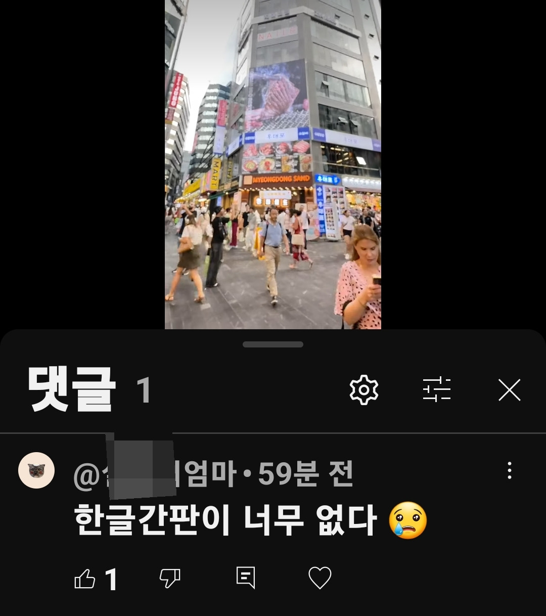 외국인 관광객이 “아, 이곳이 한국이구나” 하고 느낄 수 있도록, 한글 간판이 더 많이 돌아왔으면 좋겠다.