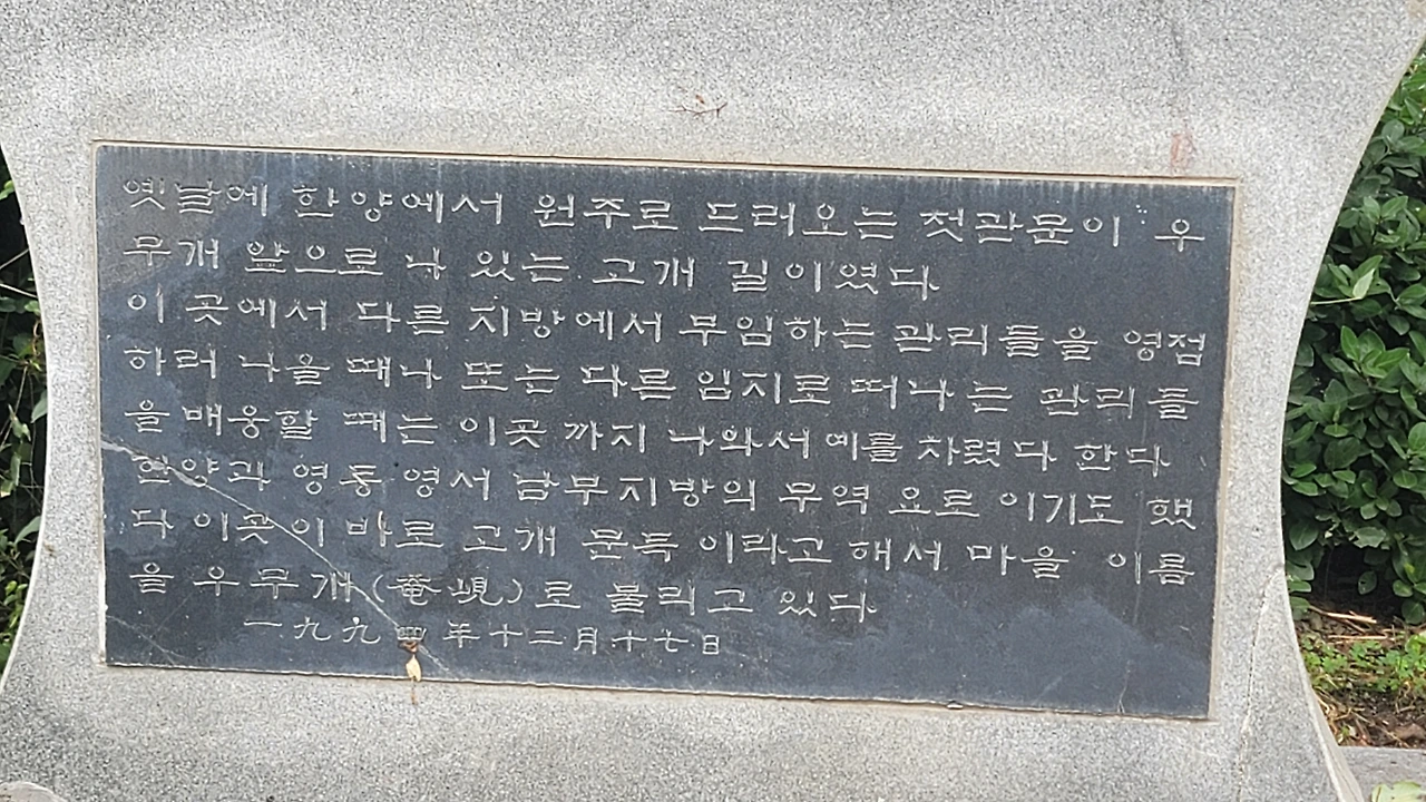 길가에 서 있는 검은 돌비석이 시선을 붙잡았다. ‘우무개’라 새겨진 글자는 세월의 바람을 고스란히 맞으며 매끈하게 닳아 있었다. 수많은 이들이 이 길을 오르내렸을 것이다. 한양에서 원주로 향하던 관리들, 장터를 오가던 상인들, 그리고 이름 없는 나그네들까지. 그들의 발자취와 숨결이 지금 이 돌에 깃든 듯했다.
