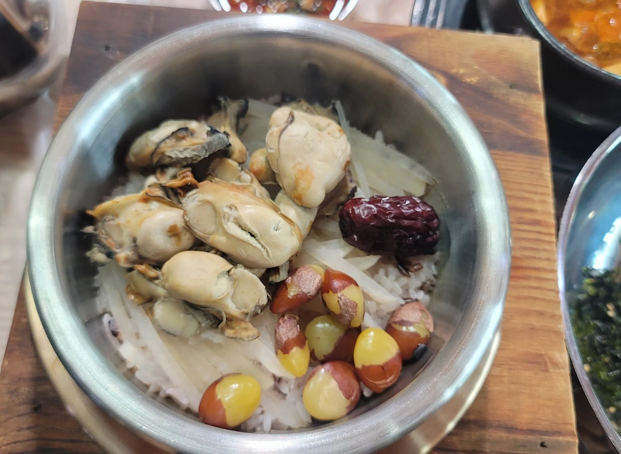 눈앞에는 하얀 쌀 위로 차곡차곡 올려진 굴, 은은히 빛나는 은행알, 고운 대추 한 알이 자리하고 있었다. 바다와 들, 그리고 계절의 기운이 한 자리에 모여 있는 풍경 같았다.