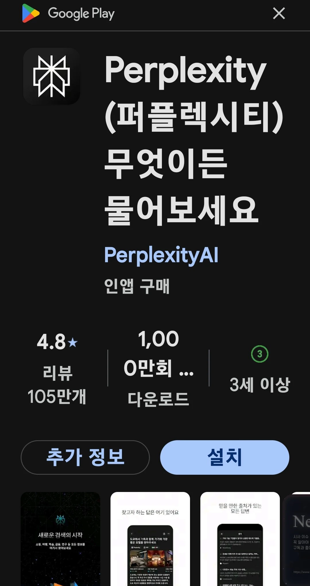 단순했지만, 어딘가 자신감 넘치는 톤이었다. 클릭해보니 바로 Perplexity AI. 평점 4.8, 1억 다운로드라는 숫자가 당당히 붙어 있었다. 순간, 궁금증이 일었다. 정말 그렇게 대단한가?