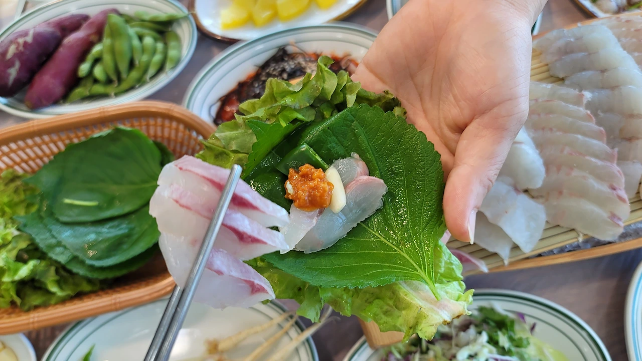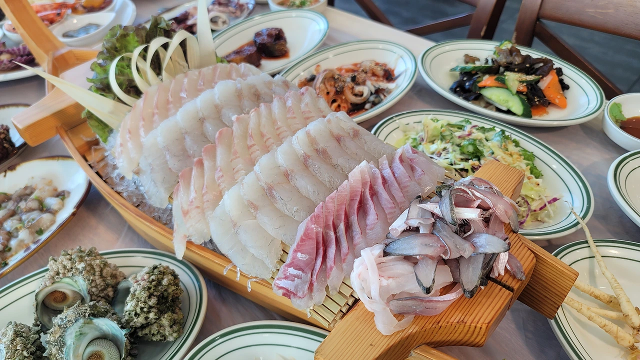 모둠회: 큼지막한 나무 배 위에 정갈하게 놓인 도미, 광어, 전갱이. 입에 넣는 순간 살아 있는 듯 탄력 있는 식감과 바닷내음이 코끝을 스친다.