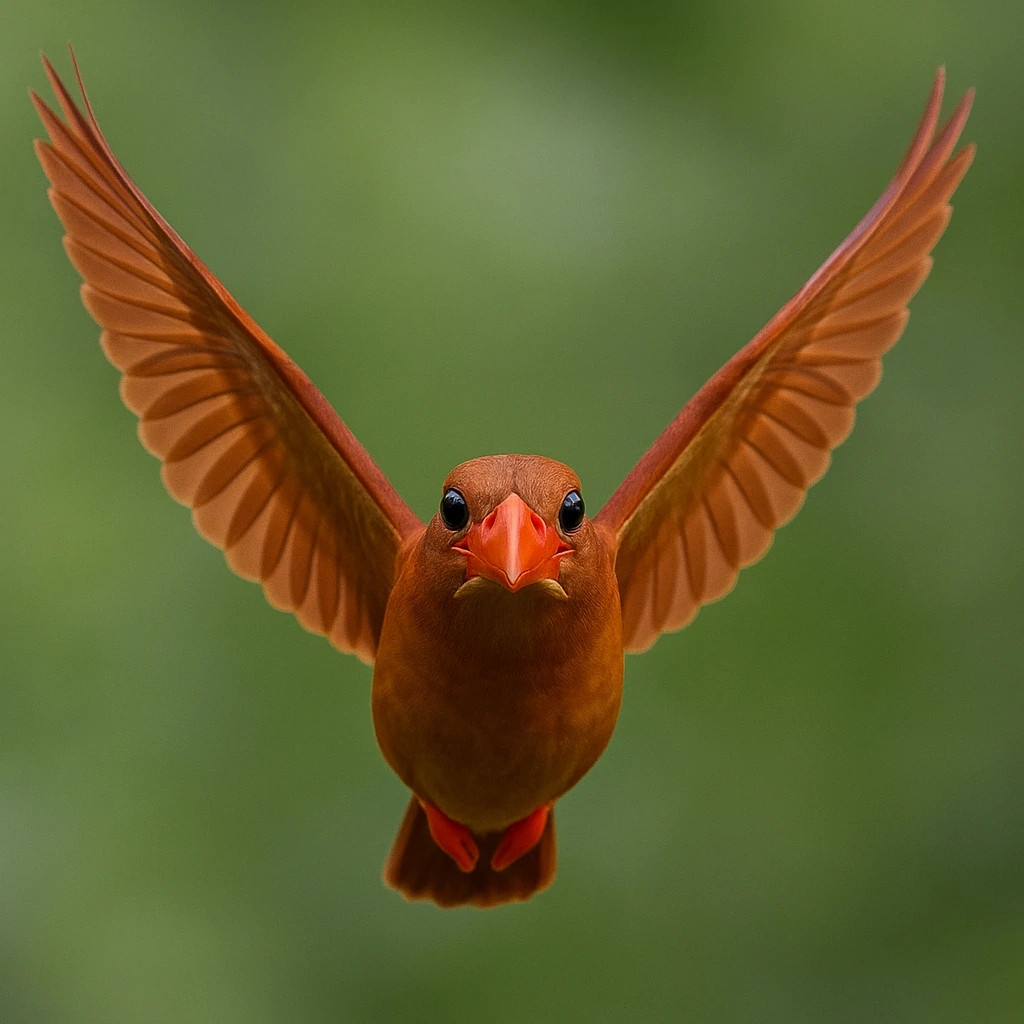 두 날개가 햇빛에 반사되어 순간 붉은 불꽃처럼 빛났고, 그 작은 몸이 숲 위를 유영하듯 가볍게 미끄러져 갔다.