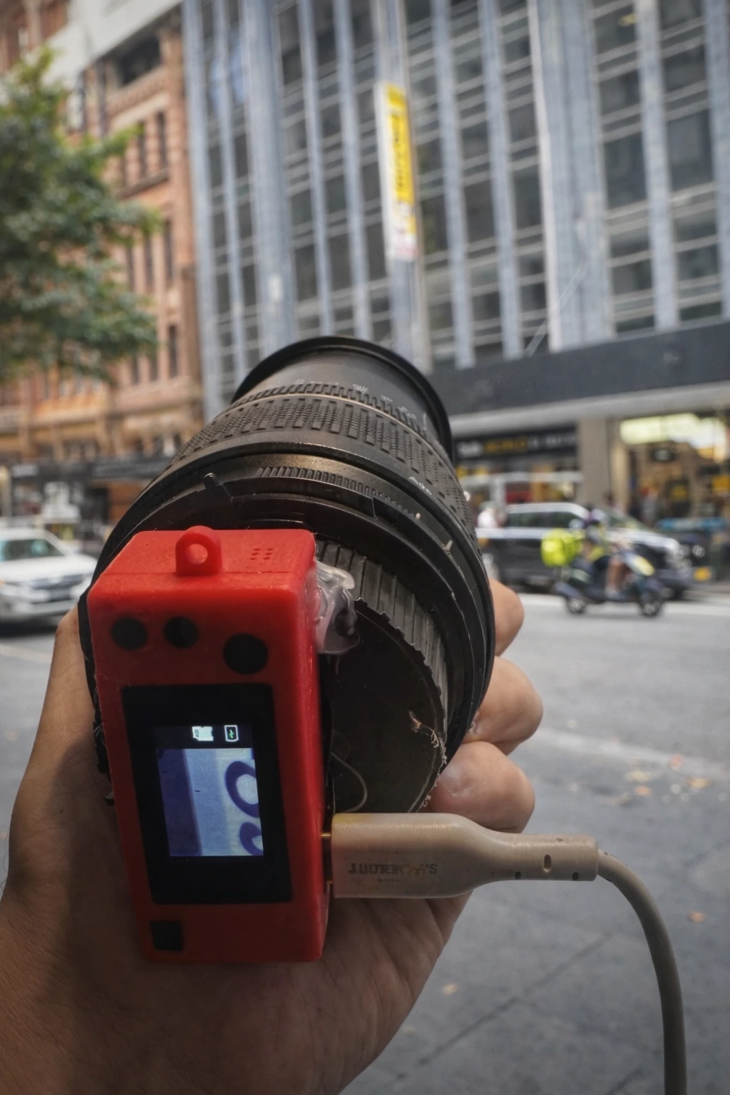현재 상태: 이 제품은 본래 렌즈에 붙여 쓰는 용도가 아닙니다. 사용자가 코닥 샤메라를 **개조(DIY)**하여 큰 카메라 렌즈의 마운트 부분에 부착한 상태입니다.