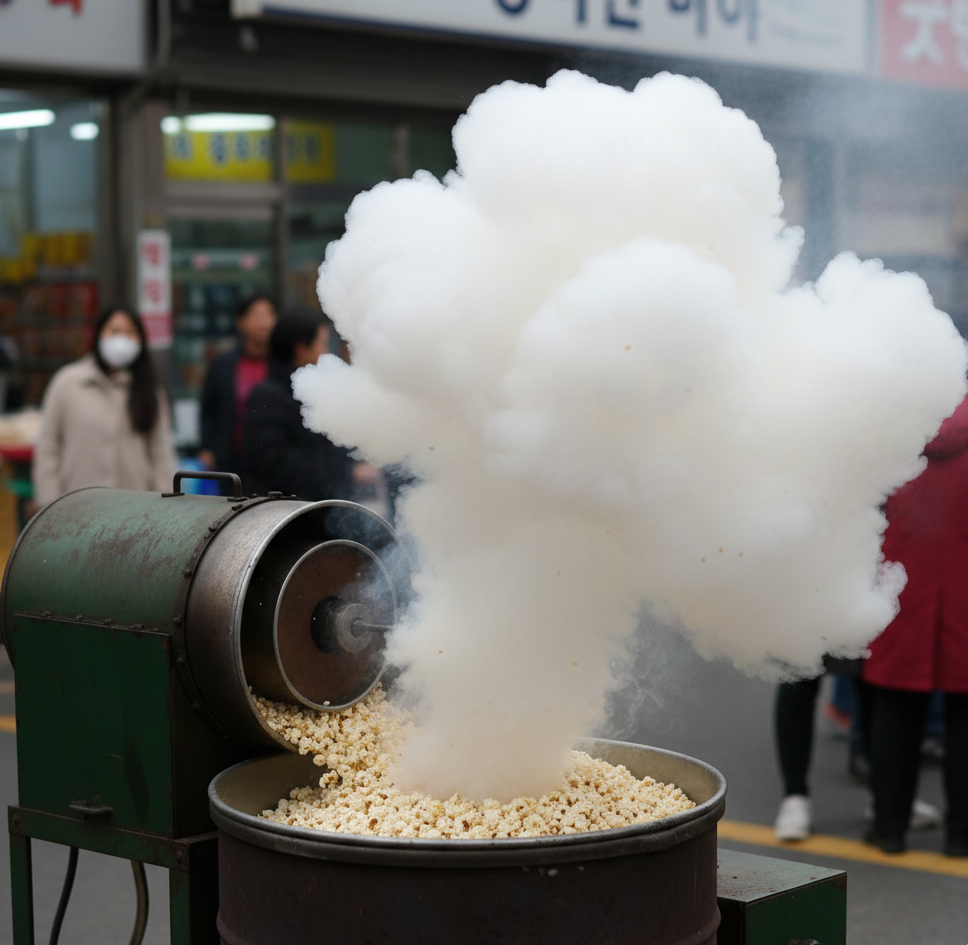 ​곡물 내부의 수분을 고온으로 가열해 수증기압을 높인 뒤, 외부 압력을 순식간에 떨어뜨려 전분 구조를 폭발적으로 확장시키는 것. 미국 대공황 시절 극장의 저렴한 엔터테인먼트로 자리 잡은 **'팝콘'**이 개별 알갱이의 자율적인 폭발에 의존한다면, 한국의 **'뻥튀기'**는 강철 원통이라는 외부의 압력을 빌려 통제된 폭발을 만들어낸다.