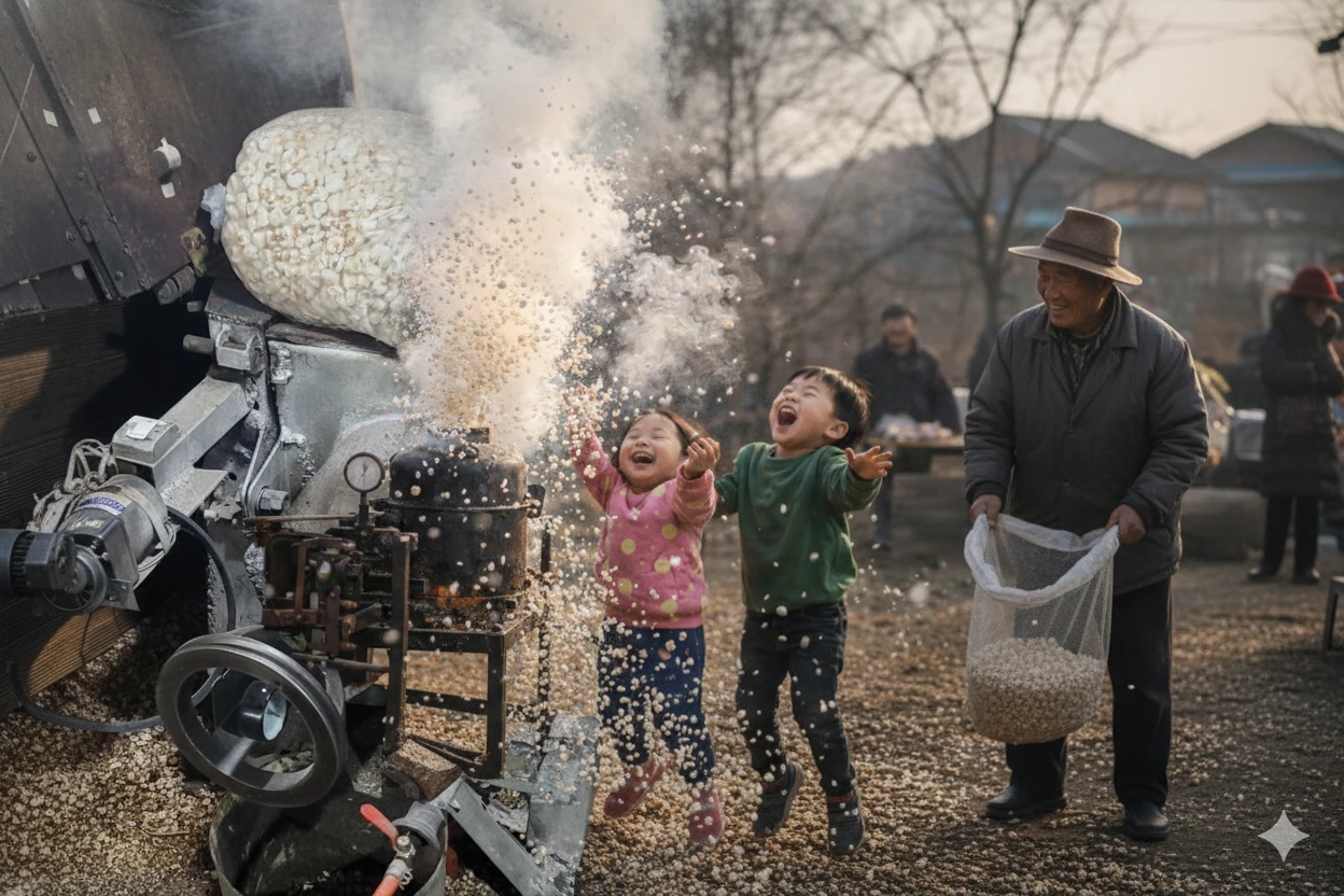 ​과거 우리에게 뻥튀기는 사 먹는 상품이기보다 '가공 서비스'에 가까웠다. 집에서 깨끗이 씻은 분유통에 옥수수 한 되를 담고, 단맛을 한 톨이라도 더 잡아두려 휴지를 한 겹 덮어 가져가던 시절. 그 작은 통 하나는 순식간에 커다란 포대가 되어 돌아왔고, 아랫목에 놓인 하얀 무명 자루는 온 가족의 허기를 달래주던 풍요의 상징이었다.