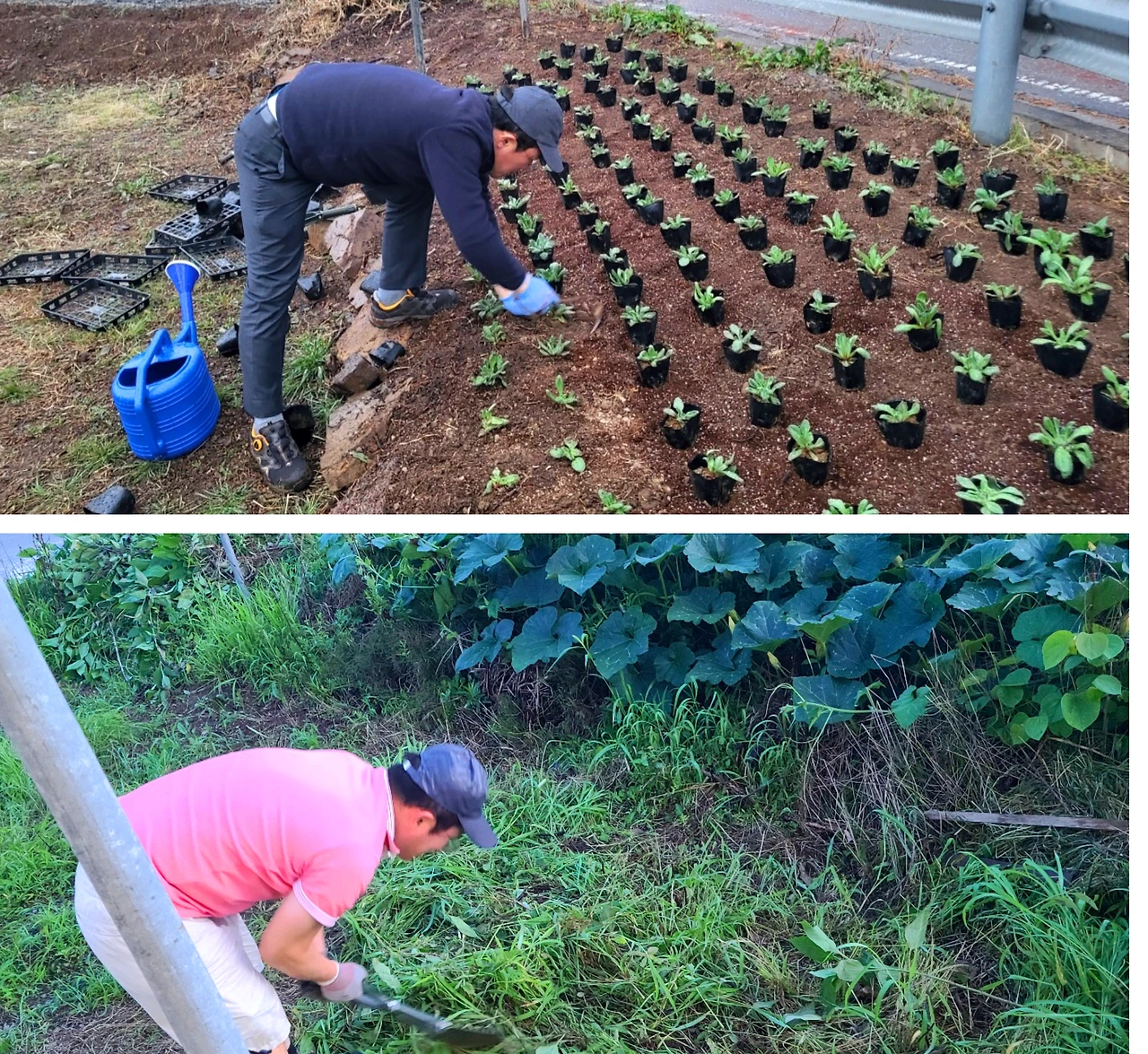 "10년 이상 방치되어 있던 도로변 퇴비더미 구역부터 개간했다. 가지치기한 나뭇가지들, 옆 텃밭에서 버려진 호박과 고구마 줄기들, 온갖 잡초들과 화초 덤불들로 뒤범벅이 되어 막대한 양의 퇴비가 만들어지고 있는 곳이다. 퇴근 후 짬을 내 치우다 보니 화단의 구색을 갖추는데만 며칠이 걸렸다. 오랜 기간 어둠 속에 갇혀 있던 음습한 공간이 햇볕 아래에서 새로운 호흡을 하며 변신을 준비한다"