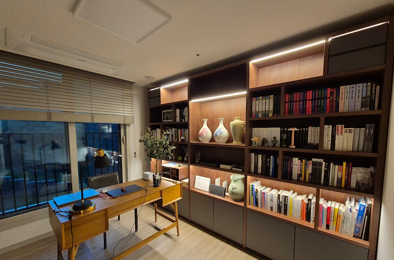 결국 맞춤 제작을 하는 수밖에 없었다. 글쓰기를 제쳐두고 책장 설계에 매달렸다. 제작은 수소문 끝낸 찾아낸 믿을만한 가구업체에 맡겼다. 그렇게 해서 세상에서 하나뿐인 책장이 서재의 한쪽 벽면을 채우게 되었다.
