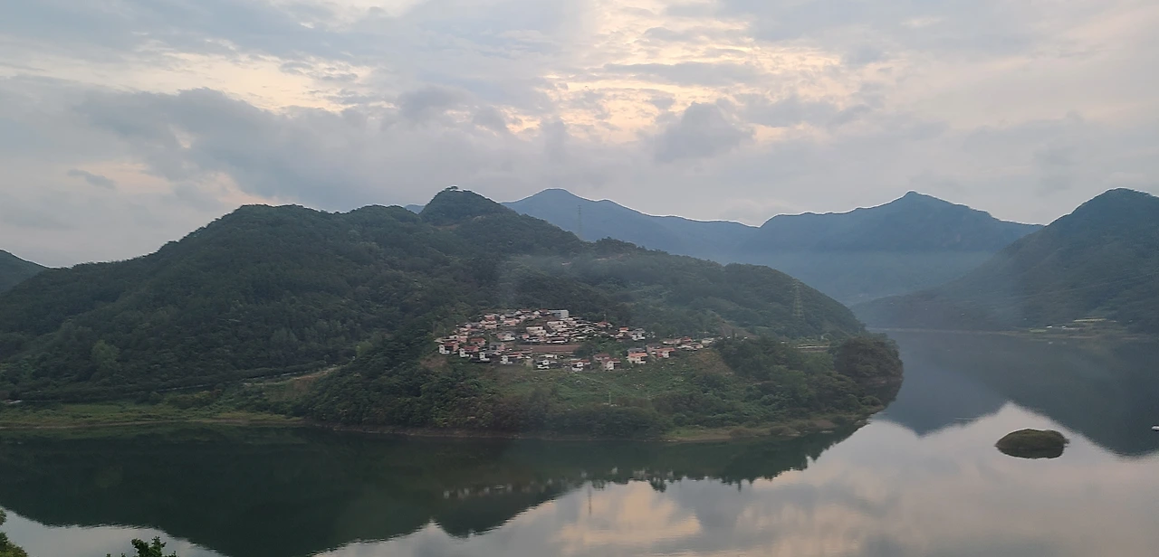 그때부터 마을의 풍경을 휴대폰에 담아보려고 애를 썼지만 번번이 실패하고 말았다. 단양이 가까워지면서부터 초집중 모드로 전환해 보지만 깜빡 잠이 들어 버리는 바람에 타이밍을 놓치기가 일쑤였다. 어쩌다가 촬영에 성공할 때도 있었지만 사진 상태는 엉망이었다. 그러다가 운 좋게 타이밍을 잘 잡아 비교적 양호한 사진 한 장을 건졌다.