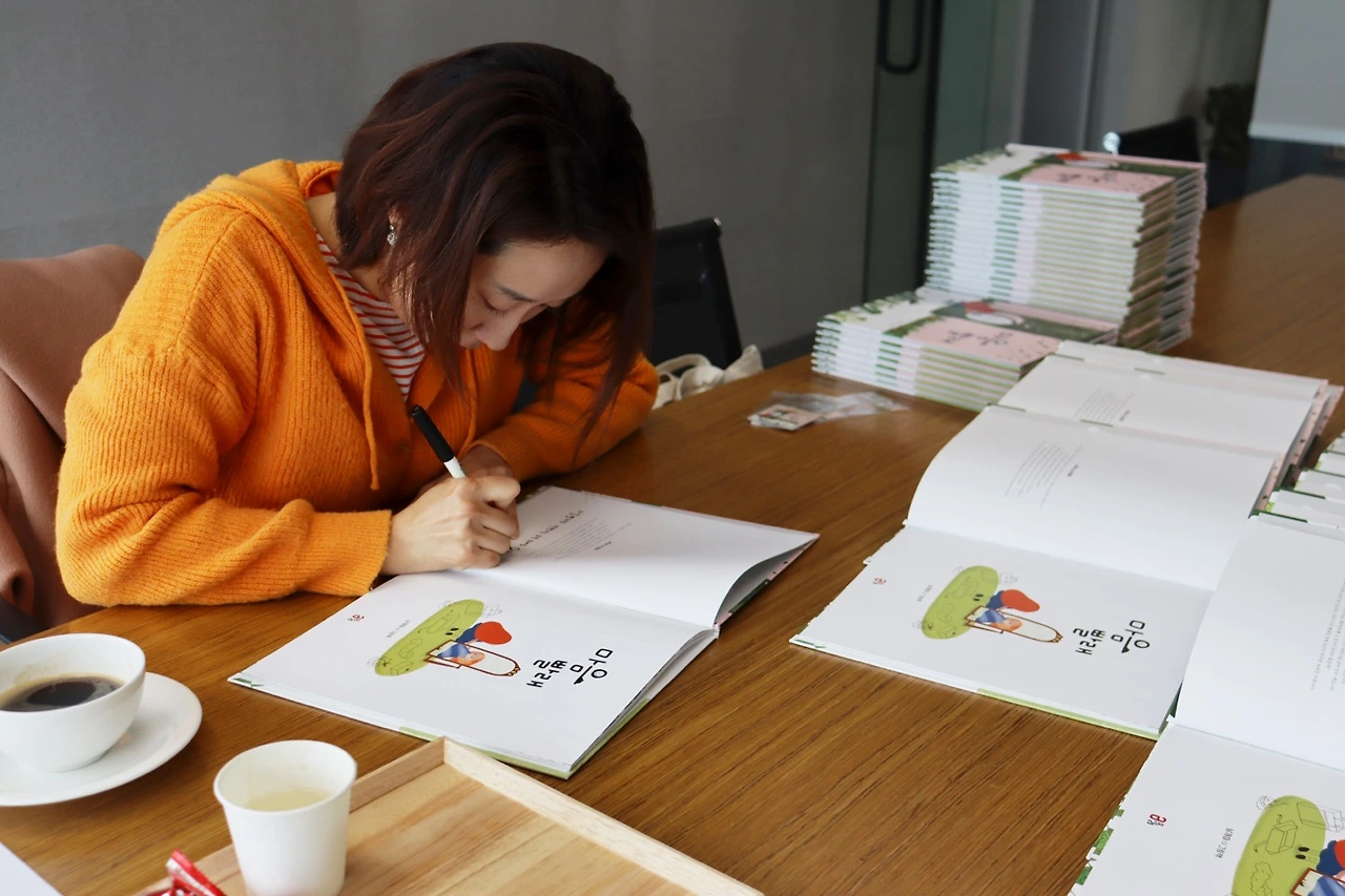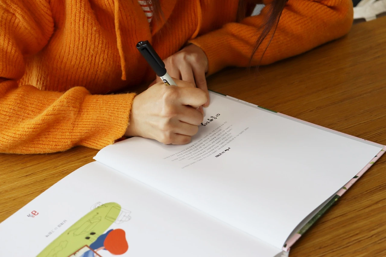 도착하자마자 나를 웃는 얼굴로 맞이해준 출판사 분들. 그분들을 따라 큰 회의실에 도착해보니 넓은 책상 위에 나의 그림책, 그리고 사인할 사인펜이 고이 놓여 있었다. 뭔가 정성스레 나를 기다려준 출판사 분들의 마음이 와닿았다. 그리고 말없이 나는 그림책을 처음 펼쳐 보았다. 조금 부끄러웠다. 편집장님과 디자인팀장님, 그리고 마케터분까지… 나는 얼른 덮고 사인을 하기 시작했다. 내가 사인하는 걸 옆에서 지켜봐 주시니 더더욱 부끄러웠다.