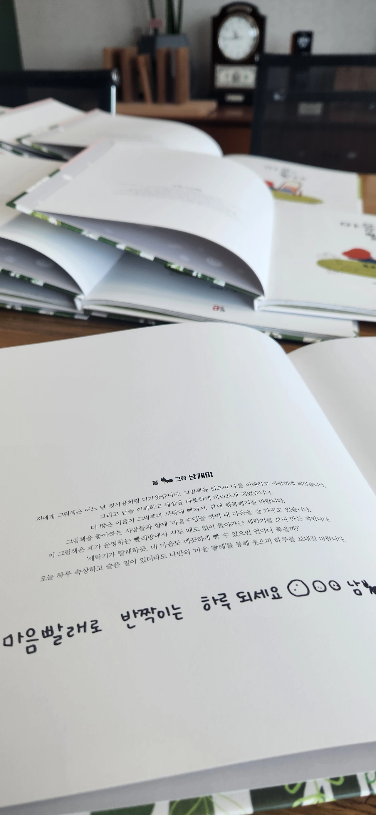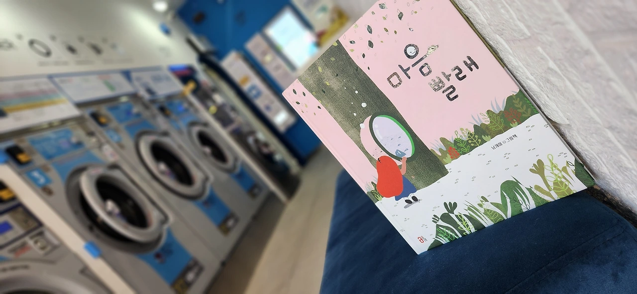 나의 <<마음 빨래>>에 영감을 준 곳, 나의 빨래방에도 그림책을 가지고 갔다. 빨래방도 운영한 지 이제 4년 차가 되어간다. 그동안 탈도 많고 말도 많았던 빨래방인데, 덕분에 이렇게 그림책을 낼 수 있게 해 줘서 참 고마운 마음이다. 빨래방을 운영하지 않았더라면, 나는 <<마음 빨래>>를 생각할 수 있었을까 싶다.