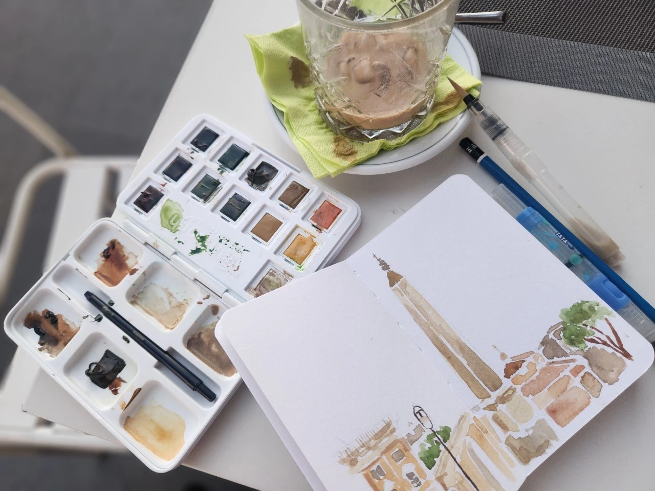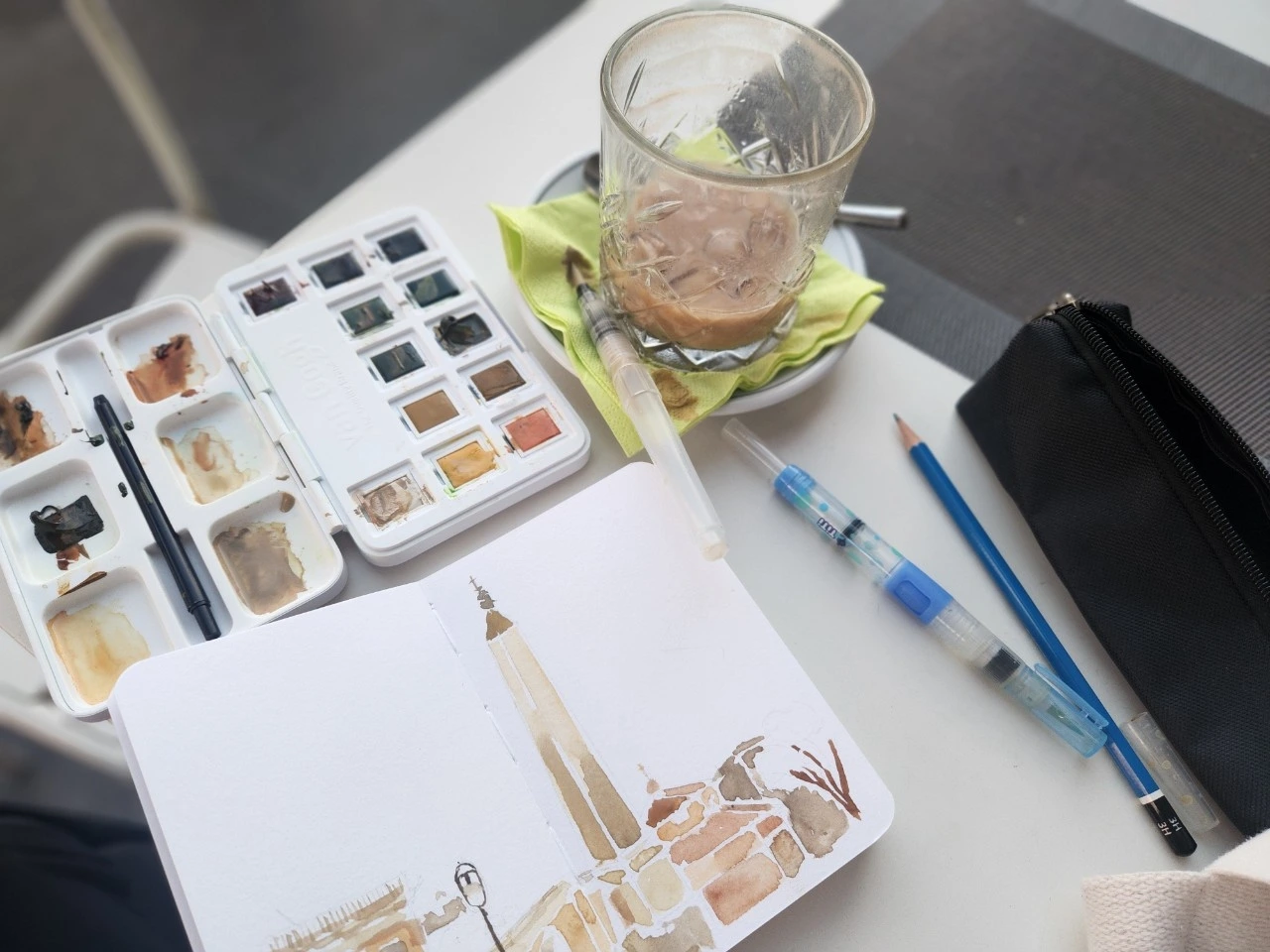 그렇게 간단히 스케치를 마친 후, 나는 이번 여행을 위해 새로 산 팔레트를 꺼내며 심호흡을 했다. 로마에 맞는 색만 딱 들어있는 팔레트. 이 팔레트를 쓰는 순간이 왔다는 것에 혼자 감동하는 시간을 잠시 가졌다. (누가 보면 뭐 대단한 팔레트도 아닌데 왜 호들갑이냐고 할 수 있지만 말이다.) 그리고 다시 한번 휴대폰을 확인했다. 다행히 가족으로부터 아무 연락이 없었음을 확인하고 이내 그림 그리기에 집중해 보았다.