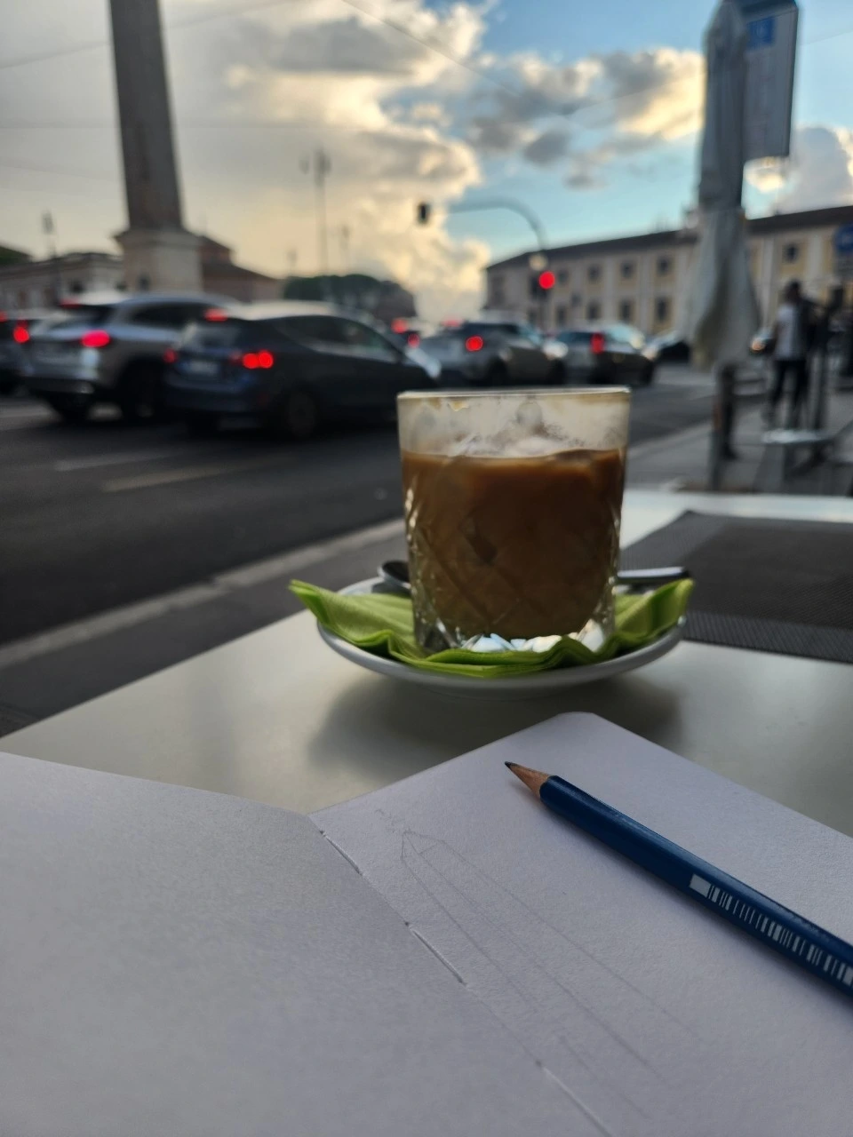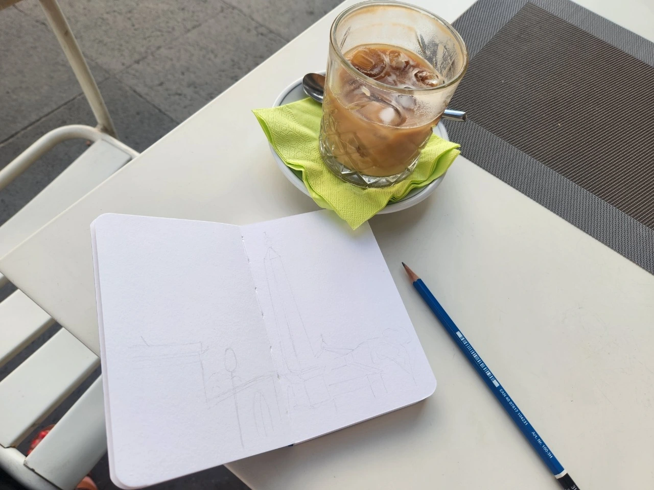 주문한 커피가 나오자마자 나는 가방에서 주섬 주섬 공책과 연필을 먼저 꺼냈다. 그림 그리기 딱 좋은 시각이었던 것이 오후 4시가 넘어가고 있었고 조금씩 하늘색이 바뀌고 있었기 때문이다. 노천카페에 들어오기 전까지는 조금 마음이 급했다. 그림을 다 그리기 전에 가족에게서 연락이 오면 어쩌지? 나는 그림을 다 완성하고 가고 싶은데? 빨리 그림을 그려야 하는데?라는 불안감을 안고 있었다.