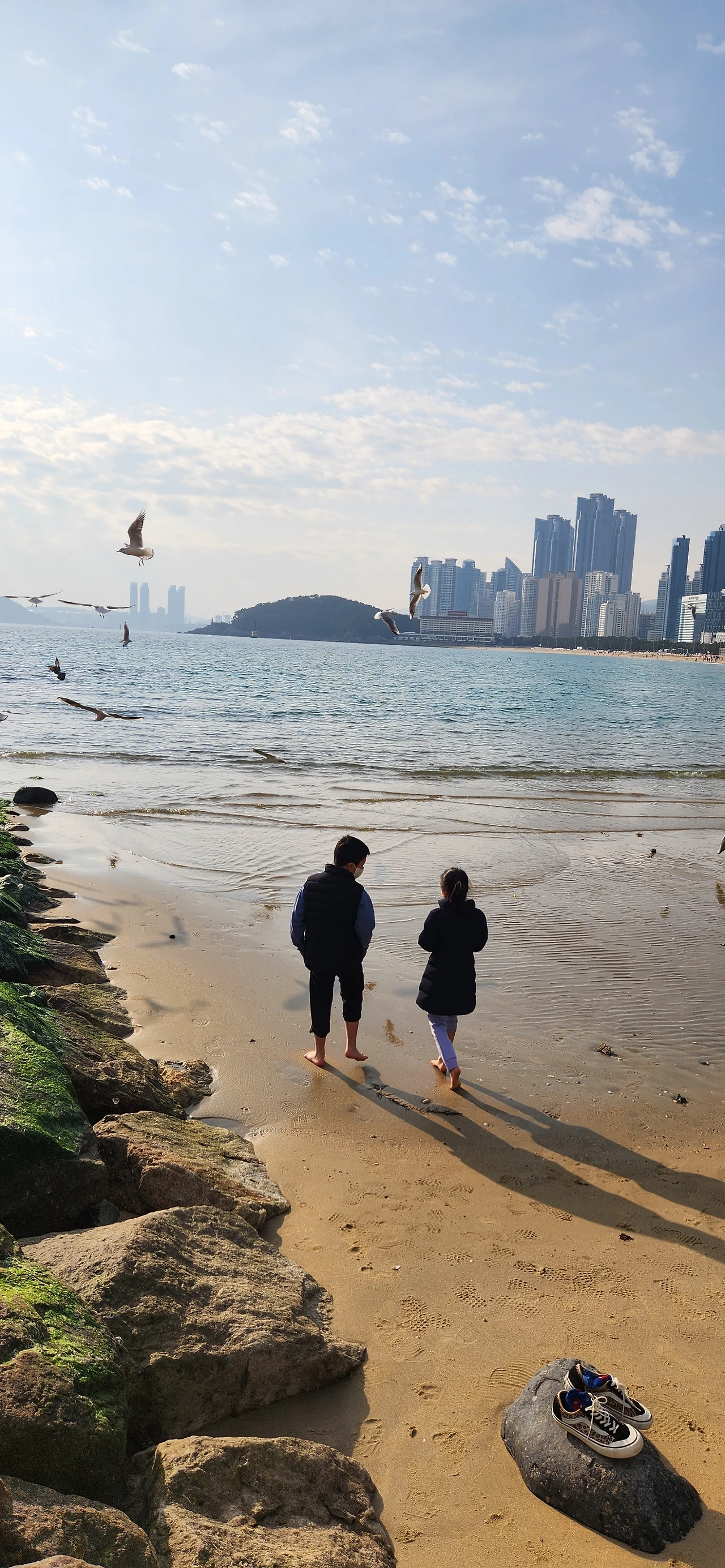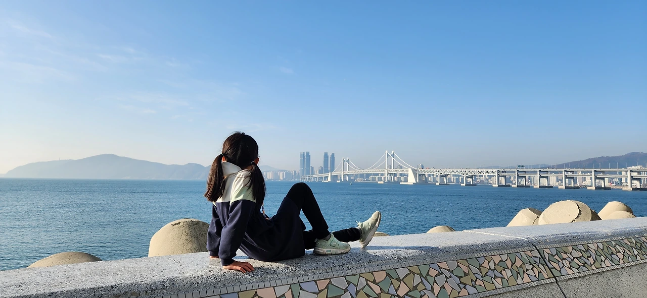 수온은 보통 2개월 정도 느린 탓인지, 아이들은 발을 담가도 추워하지 않았다. 한여름의 광안리는 (와보진 않았지만) 왠지 젊은이들로 인해 북적될 것 같은데, 지금은 겨울이라 그런지 너무 한적해서 너무 좋았다. 아이들은 1시간 정도 파도를 느끼며 신나게 노는 동안 나는 남편과 이런저런 이야기를 나누었다.