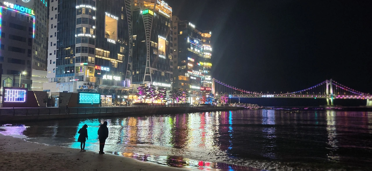 아이들이 제일 좋아했던 광안리 해수욕장. 해운대 해수욕장과 달리 광안리 해수욕장은 개인적으로 인공적인 느낌이 물씬 풍긴다. 수평선 대신 반짝이는 다리가 보여, 개인적으로 답답해 보이기도 했지만 사람들은 그 맛에 광안리는 가는가 보다. 주변에 수많은 음식점과 카페, 술집의 화려한 일루미네이션이 바다에 비추며 더욱 화려함을 자랑하는 광안리 해수욕장. 해운대처럼 길게 뻗은 해수욕장이 아니라 반원 모양으로 생겨, 한눈에 다 보이면서 안정적인 느낌을 주기도 한다.