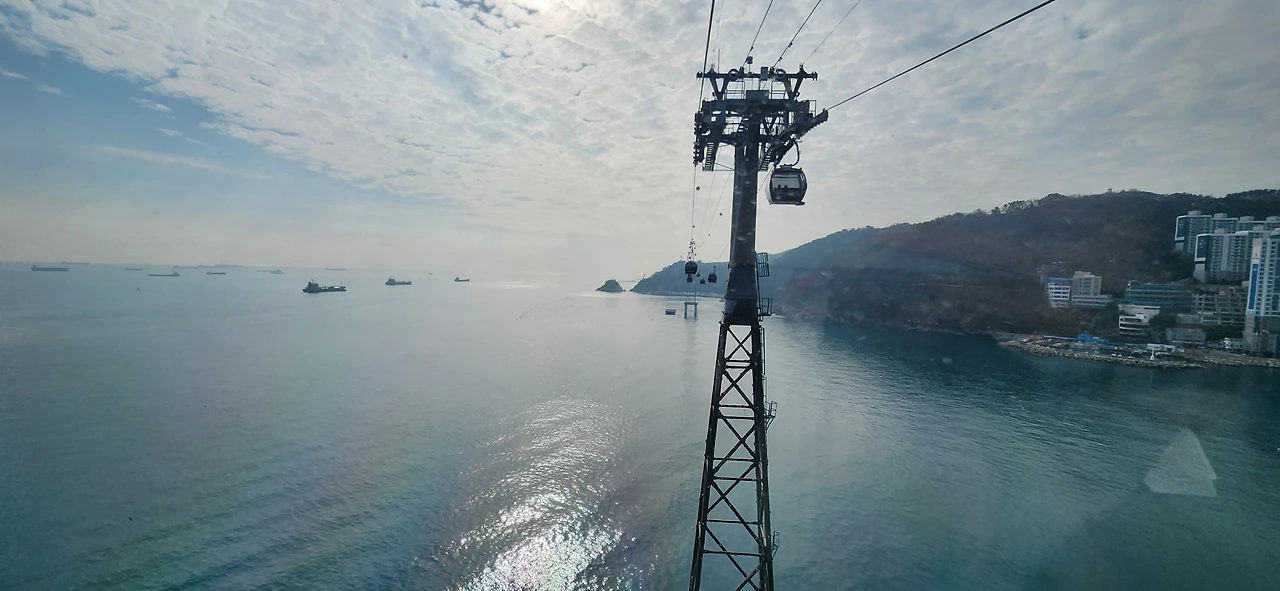 해상 케이블카 중 바닥이 유리로 된 크리스털 케이블카를 탔다. 발 밑의 바다 색이 에메랄드 색이다. 처음에만 무섭지, 사실 계속 타다 보면 무섭지도 않고 그냥 케이블카와 다를 것이 없다. 아쉬웠던 것은 케이블카를 타고 가면 용궁 구름다리가 태풍 피해로 인해 복구 중이라 가지 못했다. 그 외에는 딱히 위에서 할 것이 없다. 아, 휴게소처럼 먹을 것만 많이 판다. 덕분에 거기서 아이들은 핫도그와 오묵 등 먹으며 아쉬움을 달랬다. 어린아이들이 가면 공룡 모형도 있고 작은 놀이터처럼 꾸며져 있어서 좋을 듯 하나, 초등학생 아이들에게는 조금 시시한 감이 없지 않아 있었다.
