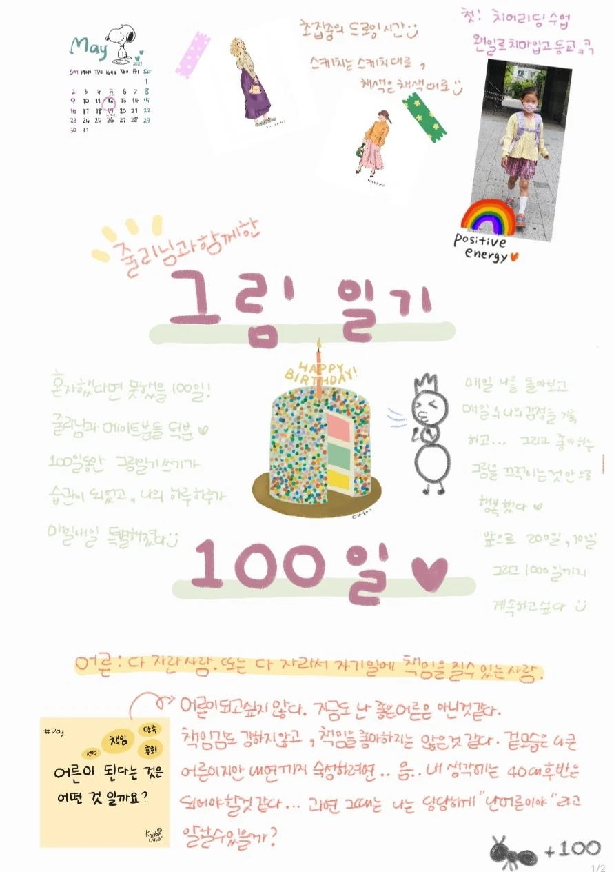 그림일기를 적으며 나는 온전히 나와 대화하는 시간을 갖는다. 그리고 표현하지 못한 내 마음을 글로, 그리고 그림으로 적는다. 어떤 날은 너무 기쁜 일을 적기도 하고 어떤 날은 한 없이 슬프고 무기력한 나를 기록했다. 혼자 일기를 썼다면 쓰다 말았을지도 모른다. 그러나 나의 일기를 보고 함께 기뻐해주고 축하해 주고 때로는 위로해 주고 응원해 주는 메이트님들이 있어서 나는 위로받으며 매일을 살 수 있었다. 날 것의 나를 적을 때 처음에는 부끄럽고 불편했는데 이제는 날 것의 나를 그대로 적어도, 그리고 때론 모든 것을 말하지 않아도 있는 그대로의 나를 봐주는 메이트님들이 있어서 힘이 된다.