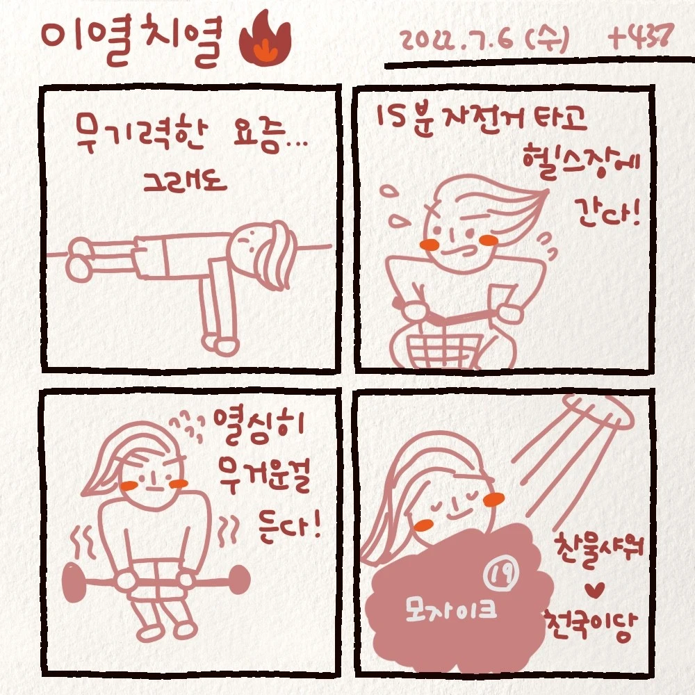 사람들은 내 몸이 건강하기 위해 비타민을 매일 챙겨 먹고 운동도 열심히 한다. 그리고 몸에 좋다는 것은 너도 나도 찾아 먹는다. 그런데 왜 사람들은 내 건강한 정신을 위해서는 신경 쓰지 않을까? 하루 10분이라도 내 정신을 돌보는 일을 왜 하지 못할까? 정신이 건강해야 몸도 건강한 데 말이다. 그래서 나는 매일 비타민을 챙겨 먹고 하루 30분 운동을 하려고 노력하듯, 매일 그림일기를 쓴다. 그림일기를 쓰며 나는 어제보다 나은 오늘을 보내고 있고, 어제보다 나은 나로 살 수 있기 때문이다.
