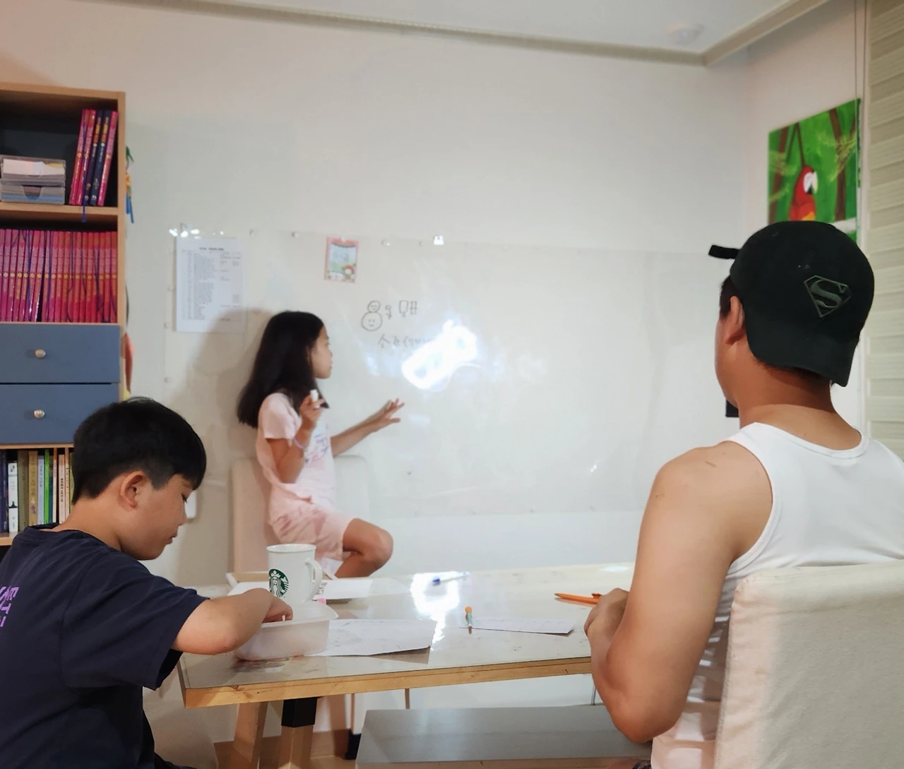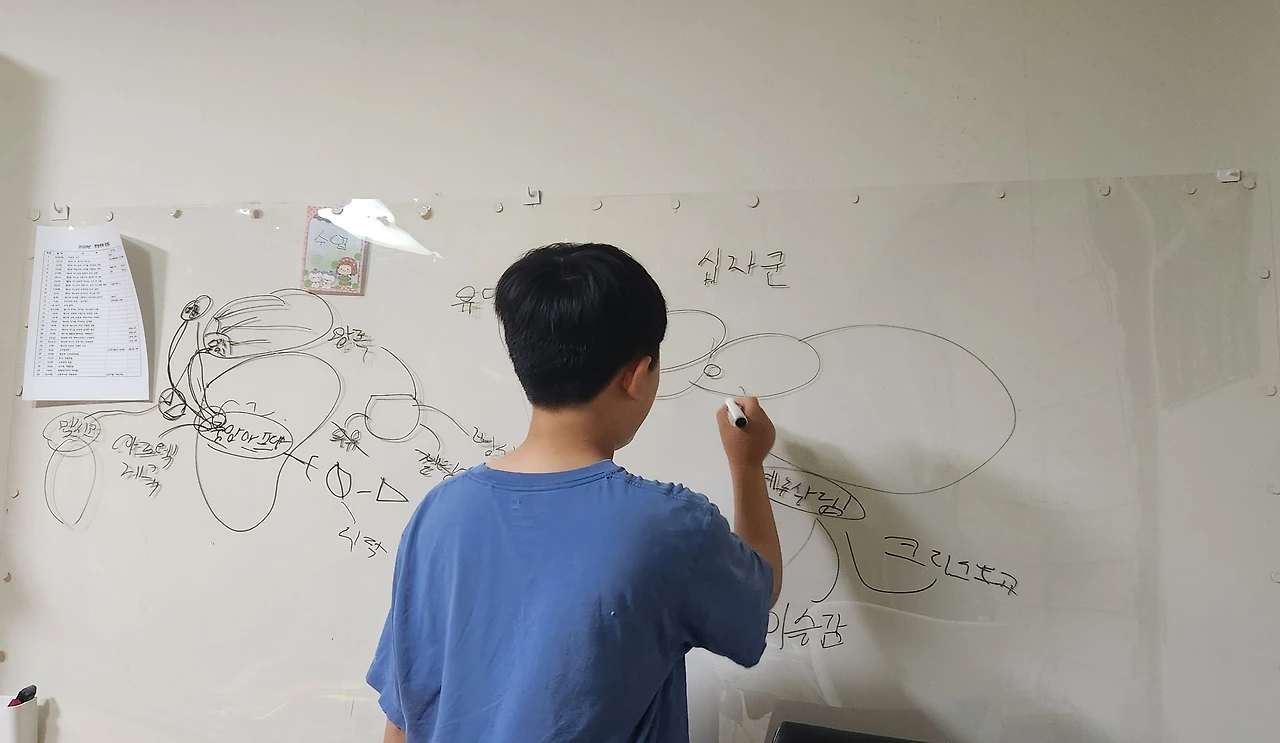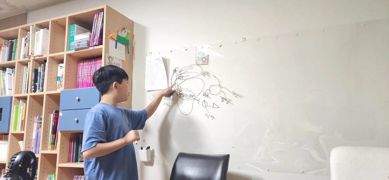 물론 이 화이트보드를 사기 전에도 가족 하브루타 시간에 우리는 이면지에다가 서로 아는 내용을 설명하는 시간을 가지곤 했다. 그러나 이번에 화이트보드를 구매하여 설치한 후, 훨씬 더 효과적임을 몸소 깨달았다. 진작에 이렇게 할 걸, 후회도 되었다.